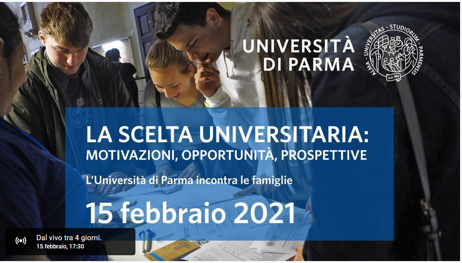 opo il rinvio per problemi tecnici di qualche giorno fa, è in programma per lunedì 15 febbraio alle 17.30, in diretta streaming sul canale Youtube dell’Università di Parma, l’incontro con le famiglie “La scelta universitaria: motivazioni, opportunità, prospettive” (link alla diretta https://youtu.be/8rN19-5Qe-0).
