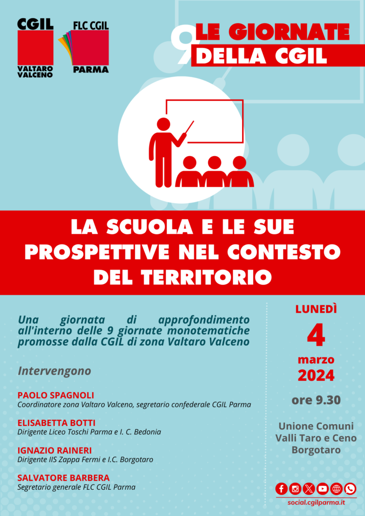 Interverranno PAOLO SPAGNOLI, Coordinatore zona ValtaroValceno, segretario confederale CGIL Parma, ELISABETTA BOTTI, Dirigente Liceo Toschi Parma e I. C. Bedonia, IGNAZIO RAINERI, Dirigente IIS Zappa Fermi e I.C. Borgotaro, SALVATORE BARBERA, Segretario generale FLC CGIL Parma.