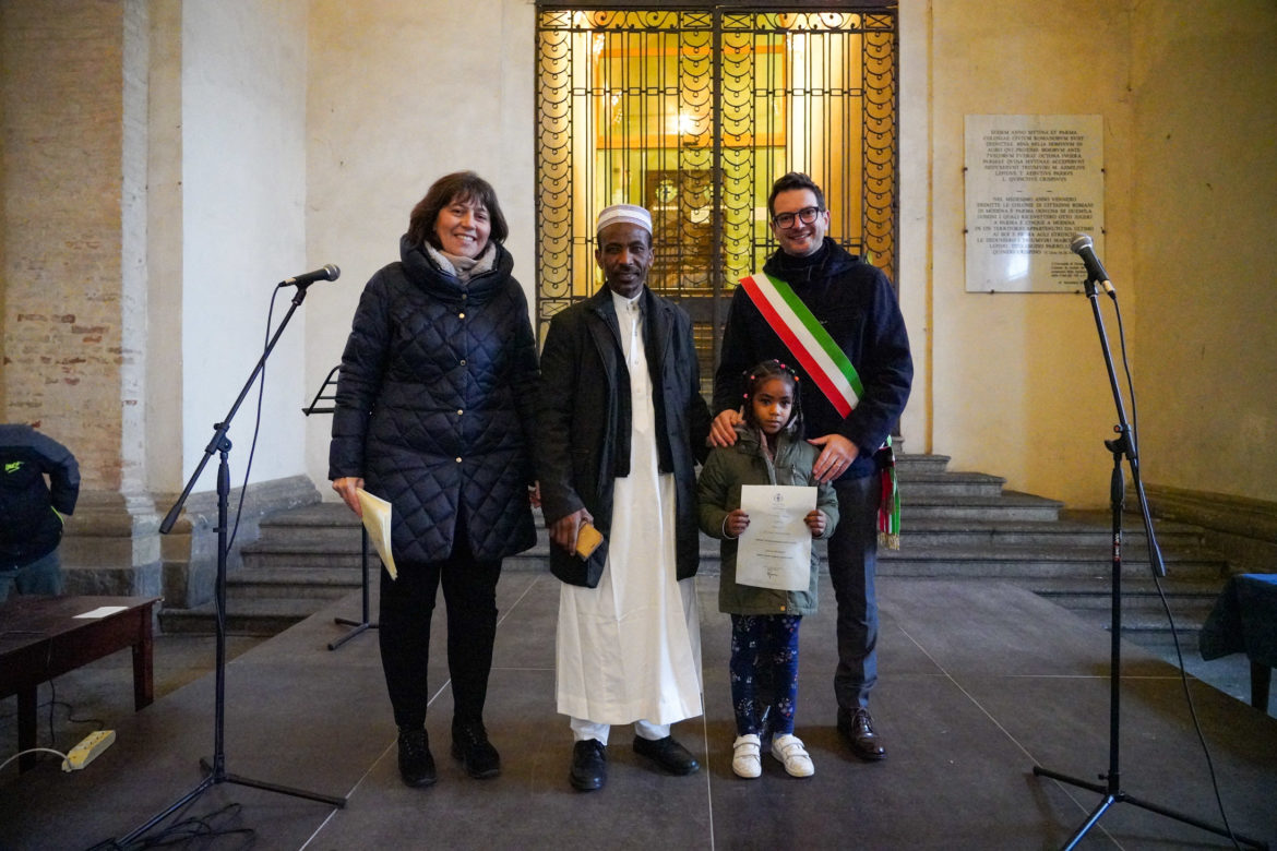 Portici del Grano gremiti di famiglie, di storie, di culture e di tante nuove vite a Parma per una cerimonia istituzionale che ha conferito l’attestato di civica cittadinanza dalle mani del Sindaco Michele Guerra e dell’Assessora alla Partecipazione e alla Pace Daria Jacopozzi ad un centinaio di bambini e bambine.