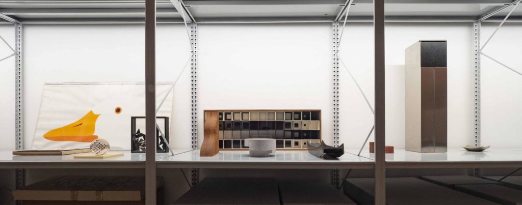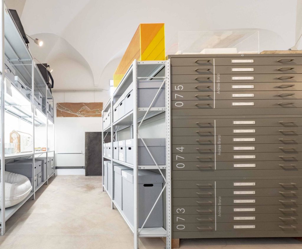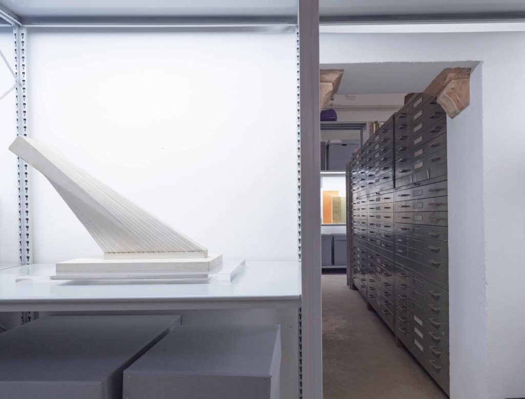Documenti grafici, immagini, manifesti, figurini ordinati per progetti nelle cassettiere convivono con oggetti, plastici, prototipi custoditi in scatole ed esposti su scaffalature, riproponendo un ritmo visivo costante dato dai tipici dispositivi metallici dell’archiviazione, interrotto da una fascia di luce che in ogni stanza segnala il luogo destinato alla esposizione. Il deposito diventa così il luogo in cui consentire al visitatore di entrare in diretto contatto con opere e documenti, comprendendo così la natura dell’archivio, il suo essere prodotto e nello stesso tempo generatore di legami, di connessioni e di contraddizioni.