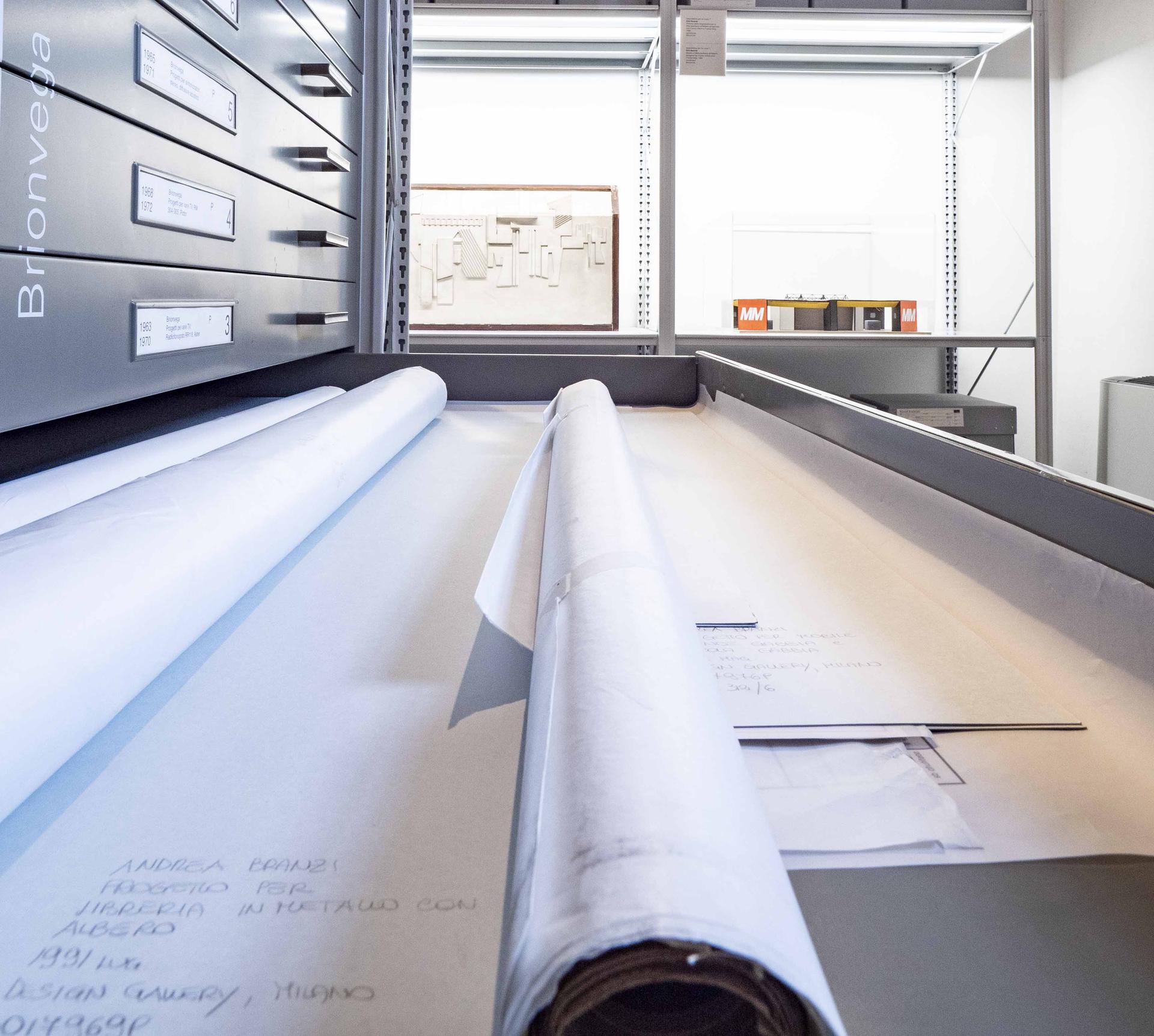 Documenti grafici, immagini, manifesti, figurini ordinati per progetti nelle cassettiere convivono con oggetti, plastici, prototipi custoditi in scatole ed esposti su scaffalature, riproponendo un ritmo visivo costante dato dai tipici dispositivi metallici dell’archiviazione, interrotto da una fascia di luce che in ogni stanza segnala il luogo destinato alla esposizione. Il deposito diventa così il luogo in cui consentire al visitatore di entrare in diretto contatto con opere e documenti, comprendendo così la natura dell’archivio, il suo essere prodotto e nello stesso tempo generatore di legami, di connessioni e di contraddizioni.