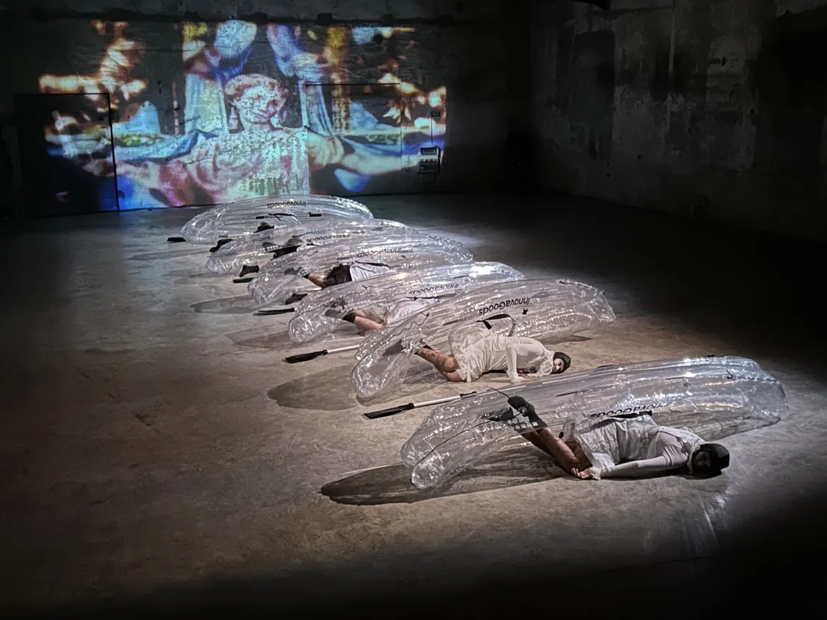 Nello spazio nudo della sala galleggiano tra le onde visive trasmutate dalle vergini del Parmigianino e le increspature sonore della cantata sacra di Bach “Wachet auf, ruft uns die Stimme” (Svegliatevi, la voce ci chiama!) riferita alla stessa parabola, i corpi plastici di sei kajak, culle lattee per le performer sospese tra l’inconsistenza del reale e il desiderio dell’ignoto, identità femminili anomale, portatrici di bellezze perturbanti e di inquietudini esistenziali.