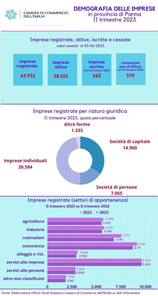 È un saldo positivo quello che il sistema imprenditoriale parmense presenta, nella sua consistenza, alla fine del secondo trimestre semestre 2023. Dalle elaborazioni dell’ufficio Studi e Statistica della Camera di commercio dell’Emilia su dati Infocamere-Movimprese, infatti, al 30 giugno 2023 in provincia di Parma risultano registrate 43.932 imprese, e il saldo del trimestre – che tiene conto di 562 nuove iscrizioni e di 370 cancellazioni non d’ufficio – evidenzia la presenza di 192 unità in più.