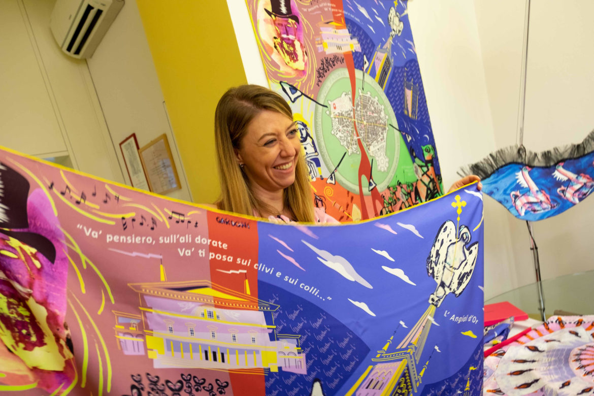 Il foulard dedicato a Parma2020 sarà disponibile su ordinazione presso lo showroom delle sorelle Gardoni (B.go del Gallo 2, Parma)