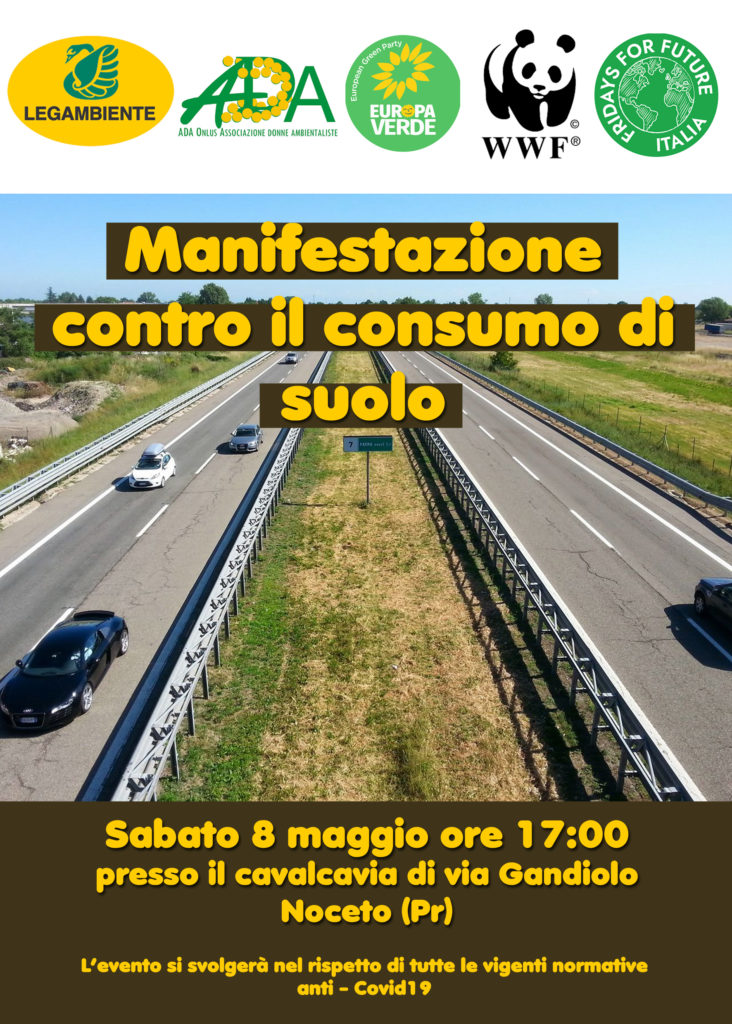 Legambiente, Verdi, WWF, in collaborazione con Associazione Donne Ambientaliste (A.D.A) ed altri gruppi ambientalisti, il giorno 8 maggio 2021, alle ore 17:00 a Noceto presso il cavalcavia di via Gandiolo, aderiscono ad un sit-in di pacifica protesta, al fine di rimarcare la necessità di salvaguardare sempre la natura e di ricordare l’importanza di edificare secondo progetti scrupolosi ed ecosostenibili.