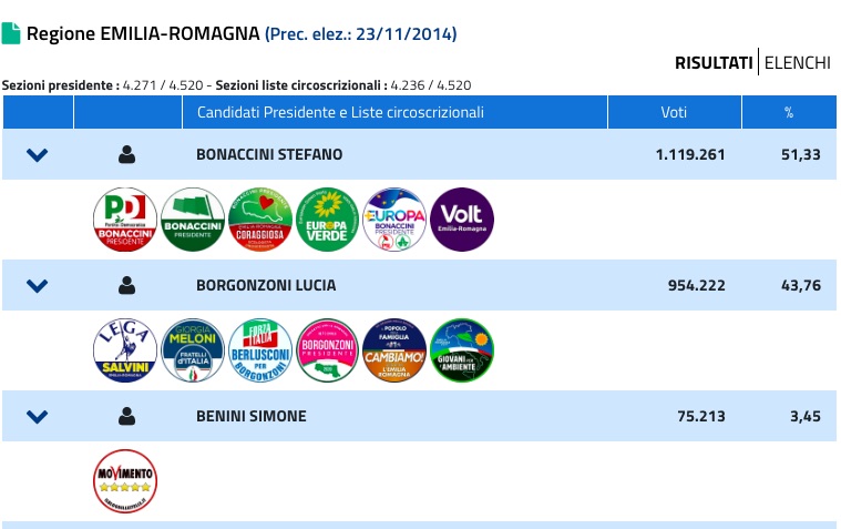 Stefano Bonaccini (centrosinistra) vince le elezioni regionali dell’Emilia Romagna con il 51% dei voti, davanti a Lucia Borgonzoni del centrodestra (45,7%) e Simone Benini del M5S (3,45%).