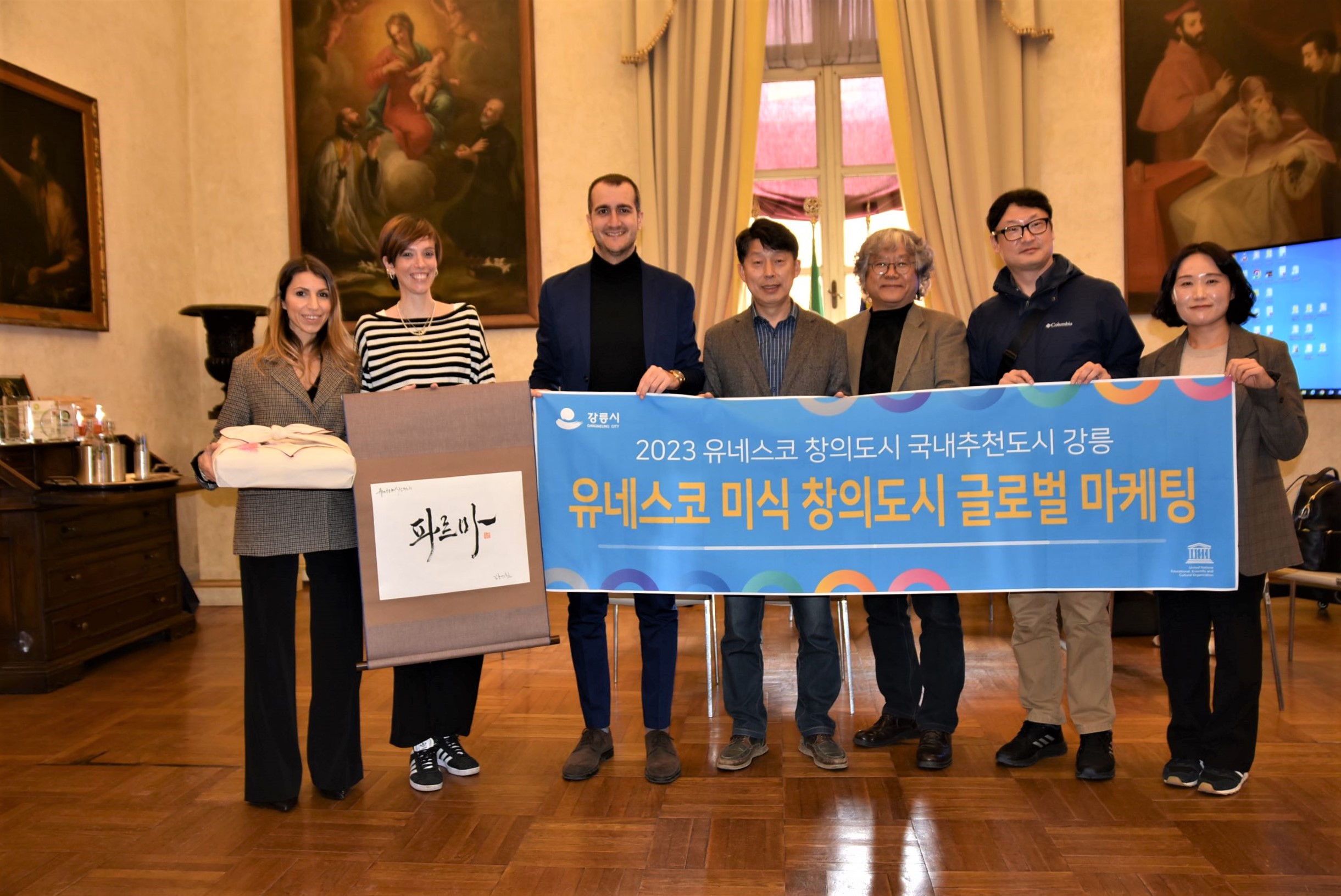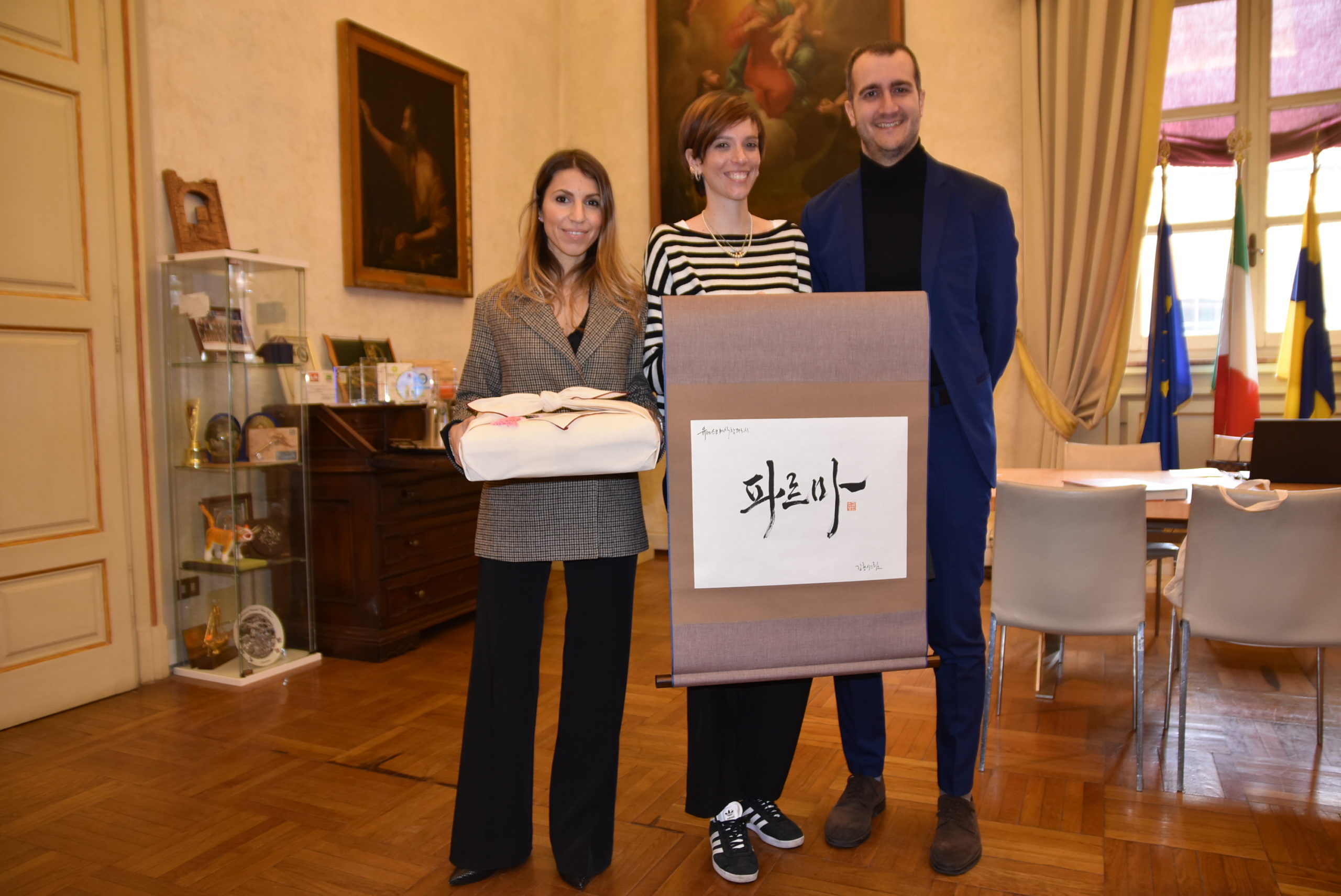 La delegazione era formata da tre funzionari del governo cittadino e da un esperto. Tra gli amministratori di Gangneung erano presenti: il Dirigente dell’Ufficio cultura, turismo e affari marittimi, Seung-Rul Han e due membri dello staff della divisione cultura e arte, Presente anche il Presidente del Comitato consultivo della Rete coreana delle Città Creative UNESCO – Commissione nazionale coreana per l’UNESCO, Geonsoo Han ed ha portato in dono un quadro su tela dove in calligrafia coreana era scritto il nome di Parma.