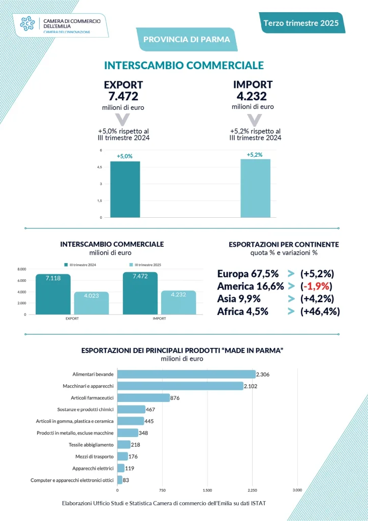 Migliora ulteriormente l’andamento delle esportazioni della provincia di Parma, che passa dal +3,9% del primo semestre 2025 al +5,0% del 30 settembre. Il valore dell’export parmense sale così a quasi 7,5 miliardi di euro nei primi nove mesi dell’anno, con 354 milioni in più rispetto al 2024.
