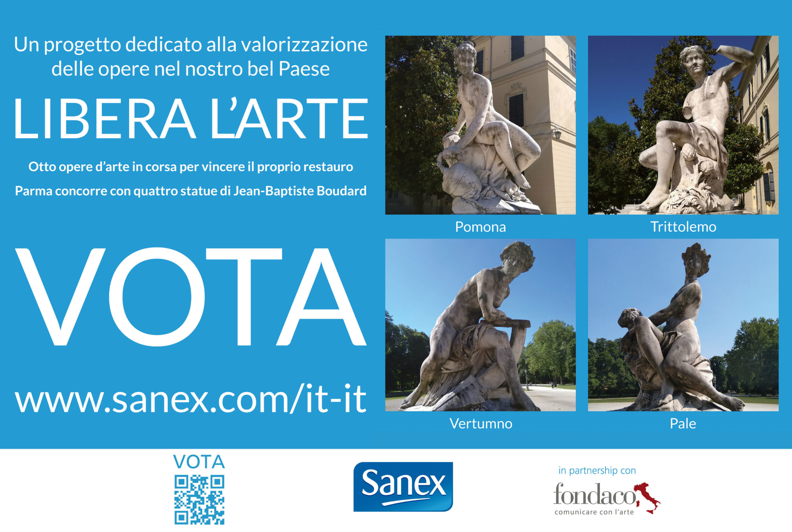 Il Comune di Parma partecipa al progetto “Libera l’arte” (nato per far conoscere e promuovere la linea di prodotti “Sanex”) proponendo il restauro delle sculture di Jean-Baptiste Boudard, in marmo bianco di Carrara, denominate “Pomona”, “Pale”, “Trittolemo” e “Vertumno”, risalenti al 1757 e situate davanti all’ingresso principale del Palazzo Ducale all’interno dell’omonimo Giardino.