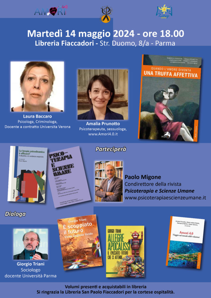 La Dott.ssa Amalia Prunotto, psicoterapeuta padovana che opera a Parma da più di vent’anni, ideatrice del progetto “Amori 4.0: l’universo degli affetti nel terzo millennio” consulente di Lidap ODV, Lega Italiana contro i disturbi d’ansia, agorafobia e attacchi di panico, attivissima realtà sul territorio e pluripremiata per l’azione sociale, è lieta di comunicare la presentazione del saggio “Quando l’amore diventa una truffa affettiva” di Amalia Prunotto, Laura Baccaro, Roberta Maggioli, Leandro Cavaliere e Roberto Cavaliere, edito da Alpes.