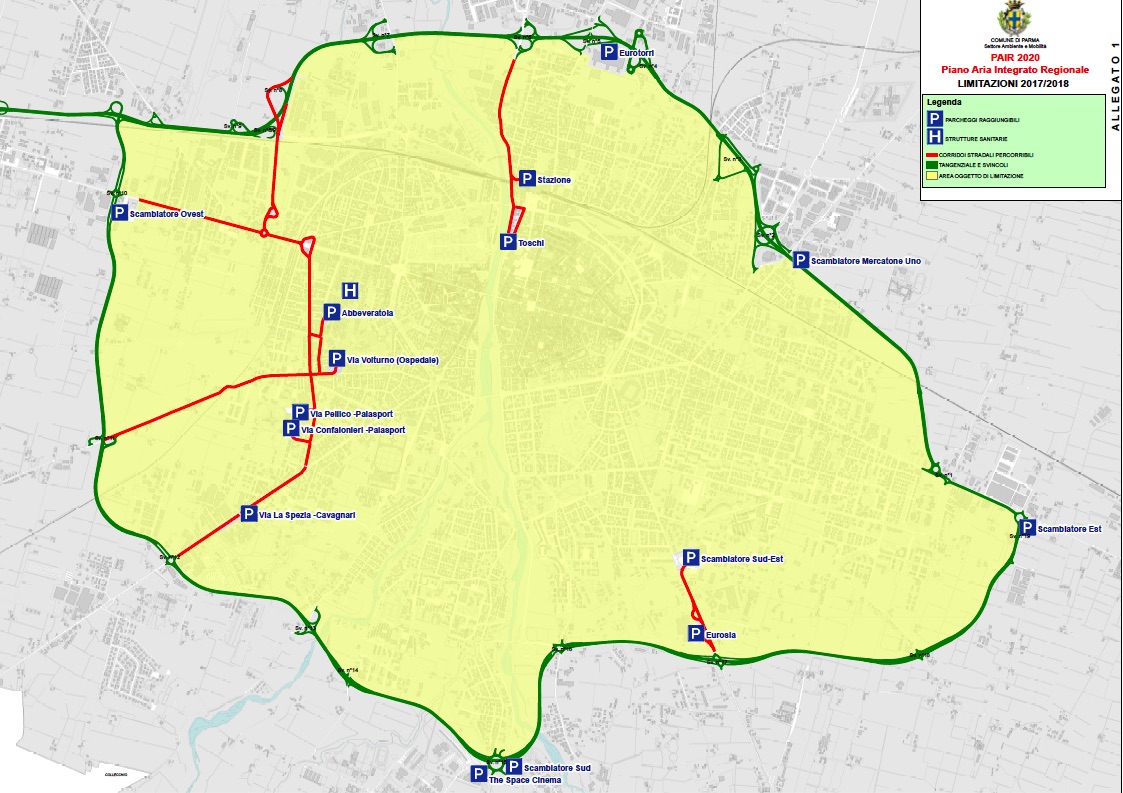 Le limitazioni al traffico sono previste entro l’anello delle tangenziali. Le auto potranno raggiungere i parcheggi scambiatori: via Emilia Ovest, via Traversetolo-Esselunga, Cavagnari, Palasport (compresi nell’area interdetta), oltre ai già fruibili parcheggi scambiatori Nord, Est e Sud, il parcheggio di strada dei Mercati e quello di via Mantova-via Scola. Sarà anche utilizzabile il parcheggio Toschi, raggiungibile solo percorrendo viale Europa, via IV Novembre in entrata, viale Toschi e viale Bottego in uscita e Park Stazione FS via Villa Sant’Angelo. Sarà raggiungibile il parcheggio dell’Ospedale Maggiore di Via Volturno, Via Abbeveratoia, mediante itinerario indicato nel testo del provvedimento.
