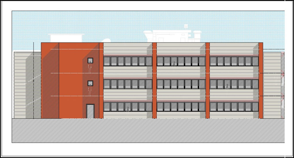 L’edificio si sviluppa su tre piano fuori terra, con la realizzazione di 9 aule – 3 per piano – oltre i servizi igienici.