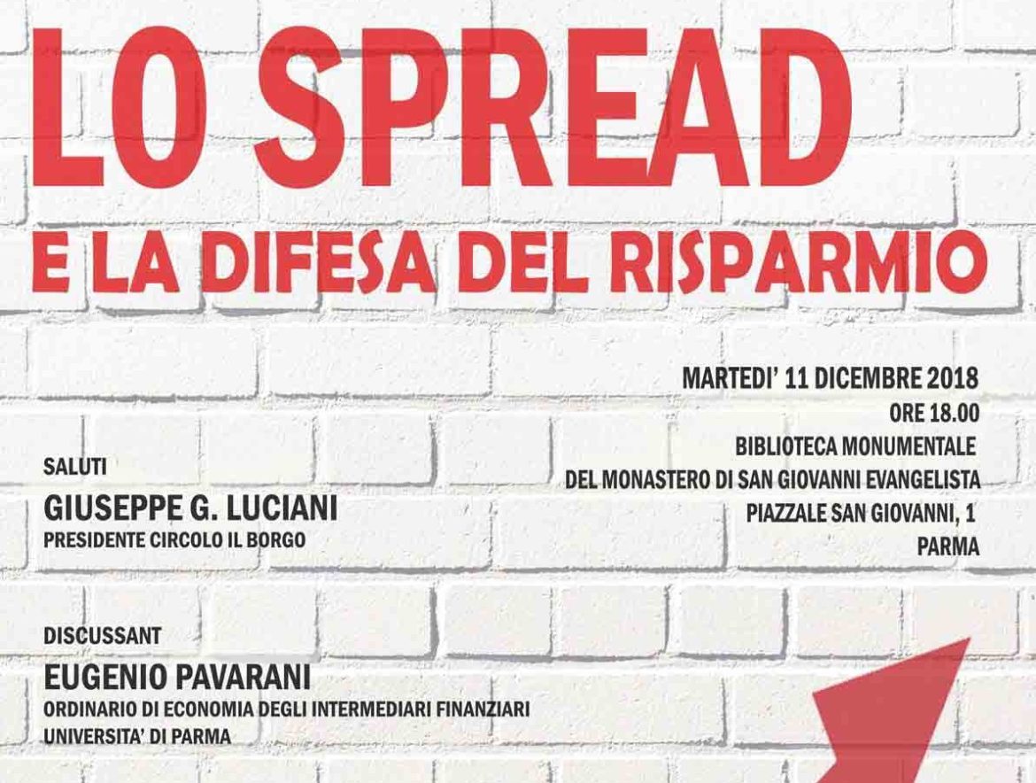 Si terrà a Parma martedì 11 dicembre alle ore 18.00 presso la Biblioteca di S. Giovanni Evangelista (piazzale S. Giovanni, 1) l’incontro dal titolo “Lo spread e la difesa del risparmio”, promosso dal Circolo Il Borgo. Dopo il saluto di Giuseppe Luciani, Presidente del Borgo, interverranno i docenti dell’Università di Parma Eugenio Pavarani (Economia degli intermediari finanziari) ed Giovanni Verga (Economia monetaria). Moderatore Giulio Tagliavini, docente di Economia degli intermediari finanziari del nostro Ateneo.
