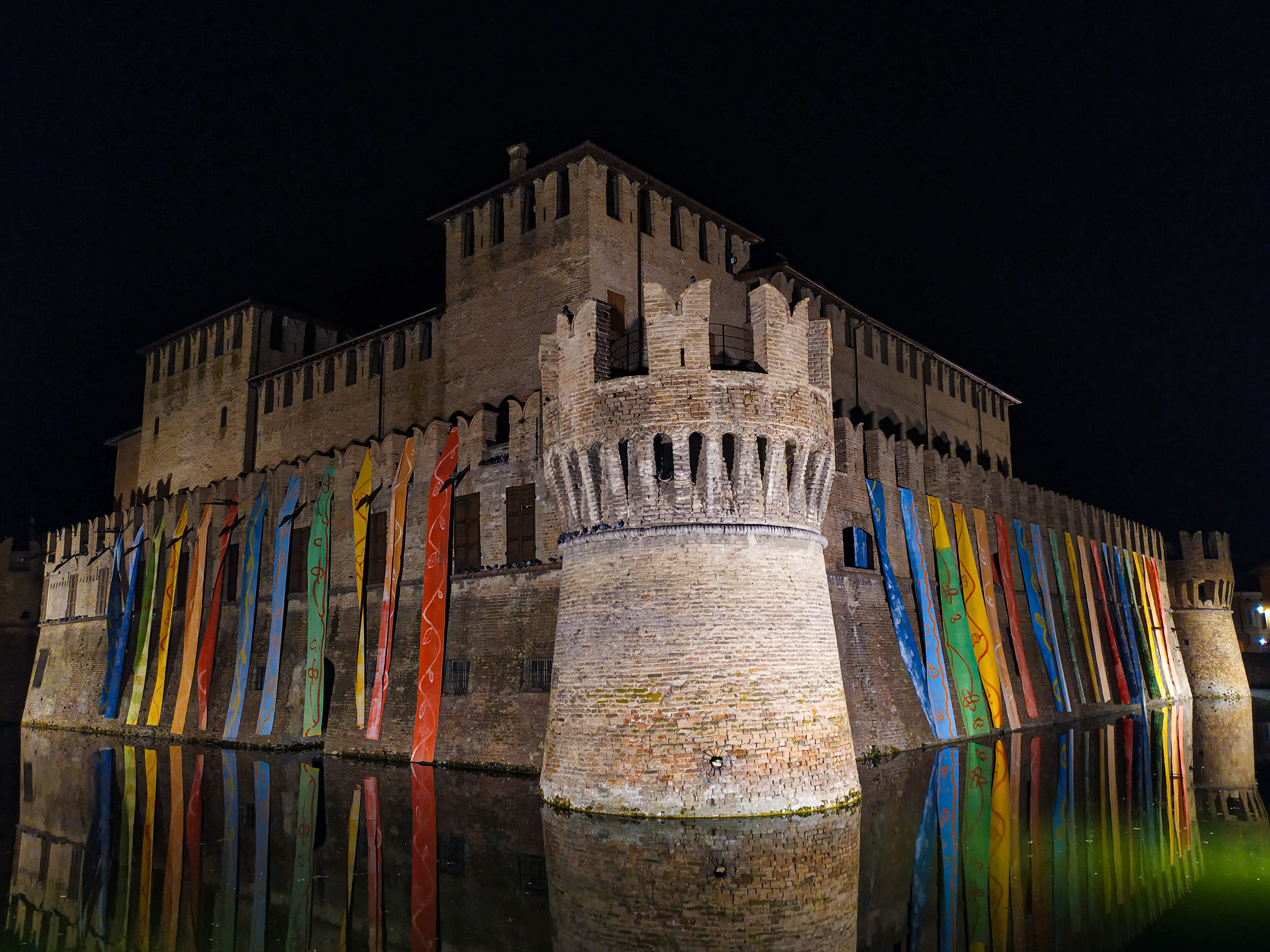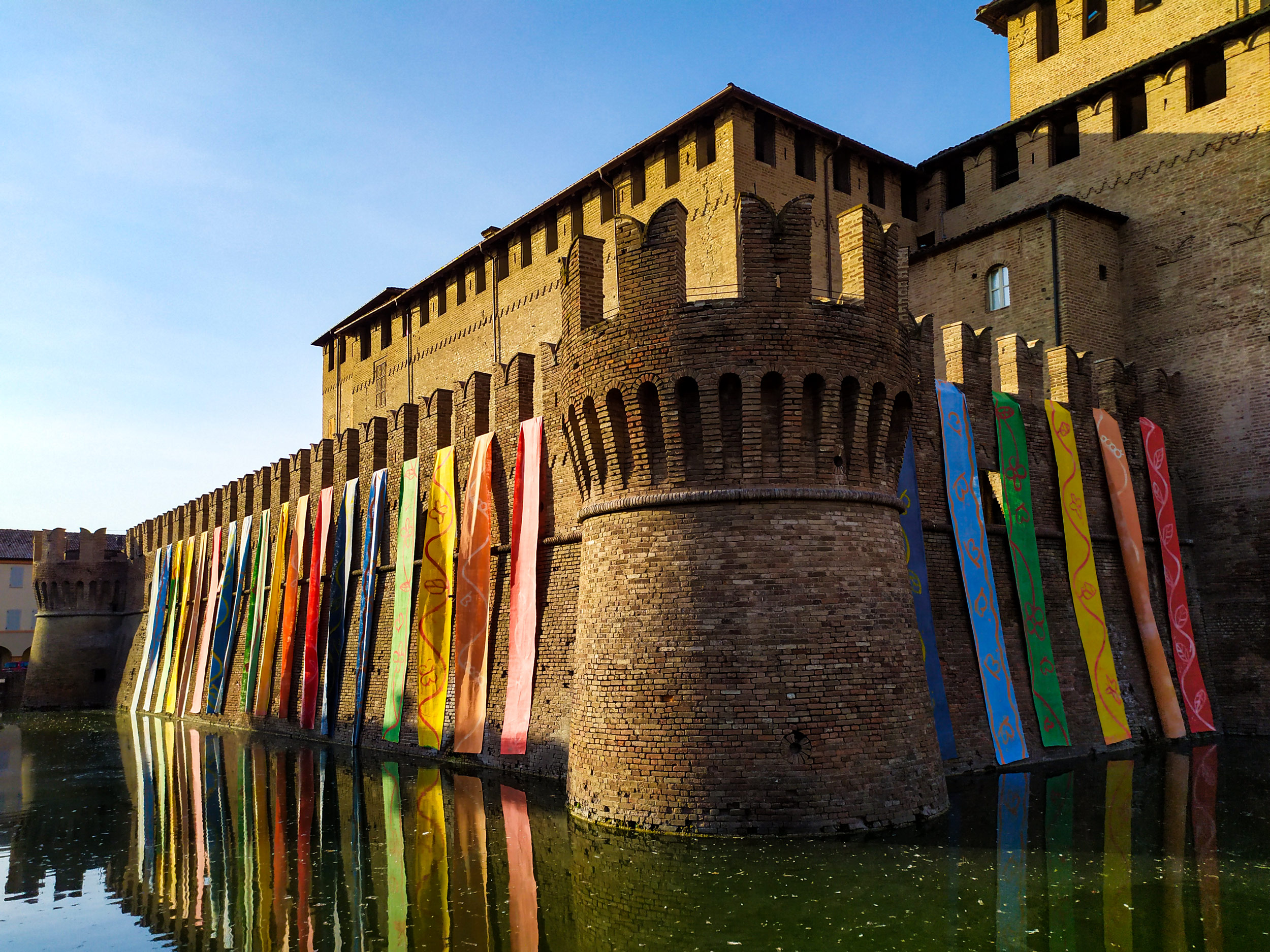 Una cascata di arcobaleni dipinti su tela splende sulle mura della Rocca di Fontanellato in un messaggio di ottimismo e speranza verso il futuro.
