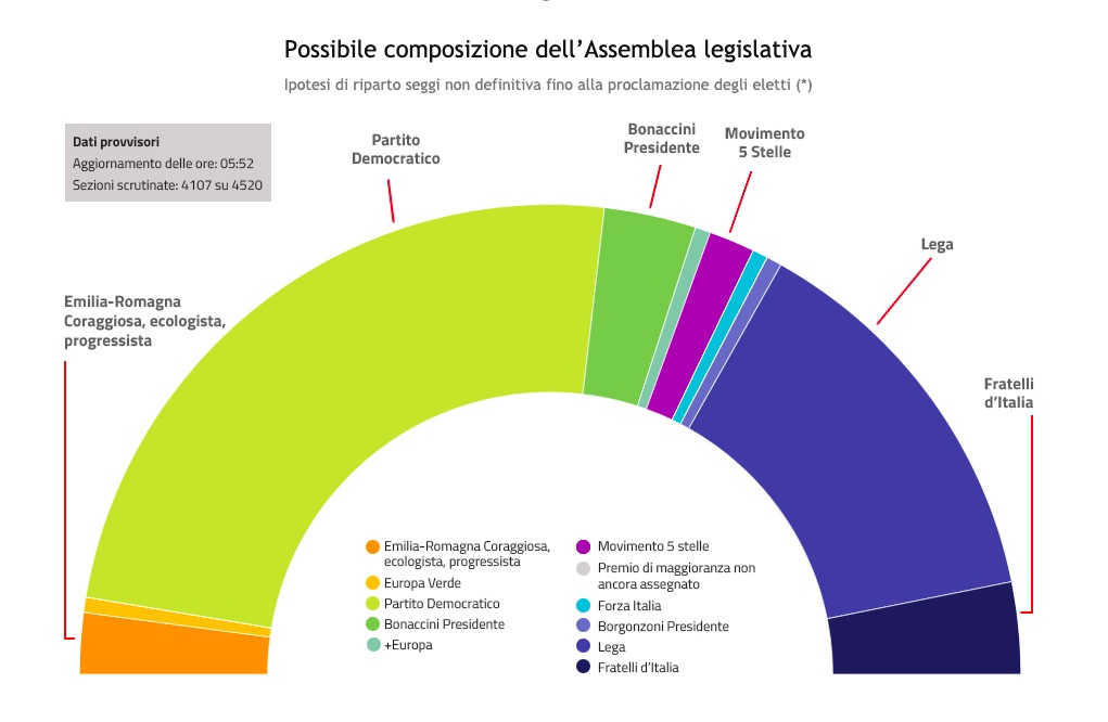 Lista Bonaccini presidente e Fdi eleggono 3 consiglieri ciascuna, 2 vanno a ERCoraggiosa e M5s mentre Europa Verde, Fi e lista Borgonzoni presidente ottengono un eletto