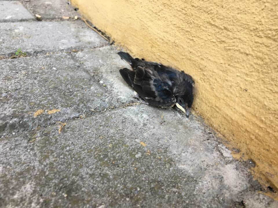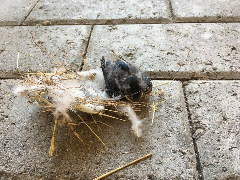 “SOS. Quattro rondanini, il papà e la mamma sono troppo per lo stesso vecchio nido sotto il nostro portico. La casetta di fango è caduta al suolo. I piccoli stanno bene. Ho chiamato la LIPU: mi hanno detto di metterli su una siepe all’ombra coi resti del nido. Fatto. Se qualcuno ha ulteriori consigli sono benvenuti. Il problema sono i gatti della zona. Help!”.