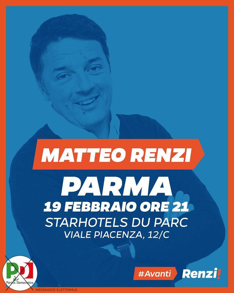 Il segretario nazionale del Pd Matteo Renzi sarà a Parma il 19 febbraio alle ore 21 presso Starhotel du parc in viale Piacenza 12/c.