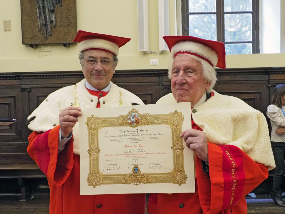 Oggi l’Università di Parma ha conferito a Bernardo Valli, grandissimo reporter di due secoli, la Laurea magistrale ad honorem in Giornalismo, cultura editoriale, comunicazione ambientale e multimediale. In Aula Magna tanti amici e colleghi di Valli, arrivati a rendergli omaggio in questo suo particolare “ritorno a casa”.