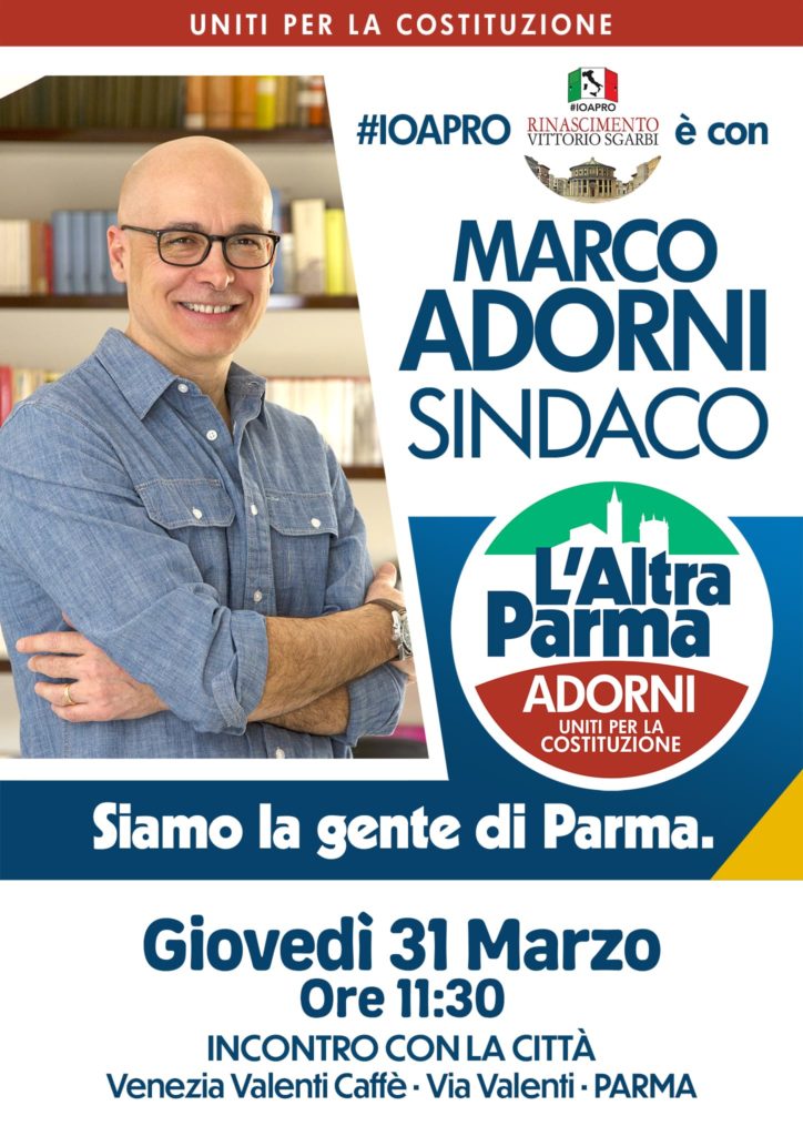 A suo sostegno ci sarà il movimento IoApro Rinascimento di Vittorio Sgarbi. Spiega Umberto Carriera, Segretario Nazionale del Partito: “Senza bisogno di ricorrere ad etichette, Marco Adorni, crede nel diritto al lavoro, nella tutela dei diritti sociali, nel senso sociale della comunità intesa quale solidarietà anti-utilitaristica. Per questo “Io Apro Rinascimento” sostiene la sua candidatura, l’unica credibile alternativa che può interpretare la realtà politica attuale e contemporanea.»