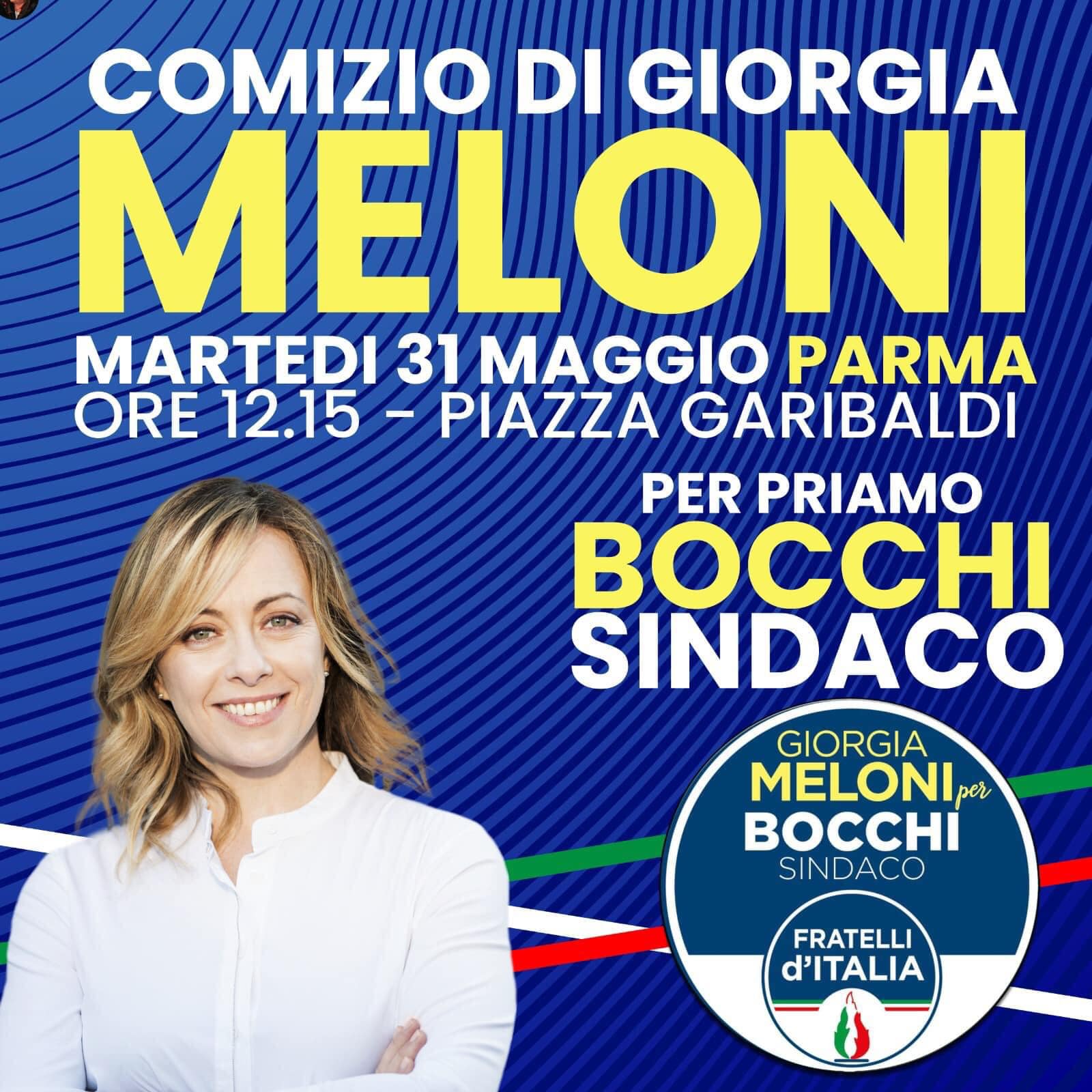 Martedì comizio di Giorgia Meloni in piazza Garibaldi a sostegno della candidatura di Priamo Bocchi di UG 25 Maggio 2022 25 Maggio 2022 90 Martedì 31 maggio alle ore 12.15 si terrà in piazza Garibaldi il comizio di Giorgia Meloni, leader nazionale di Fratelli d’Italia, a sostegno della candidatura a sindaco di Parma di Priamo Bocchi.