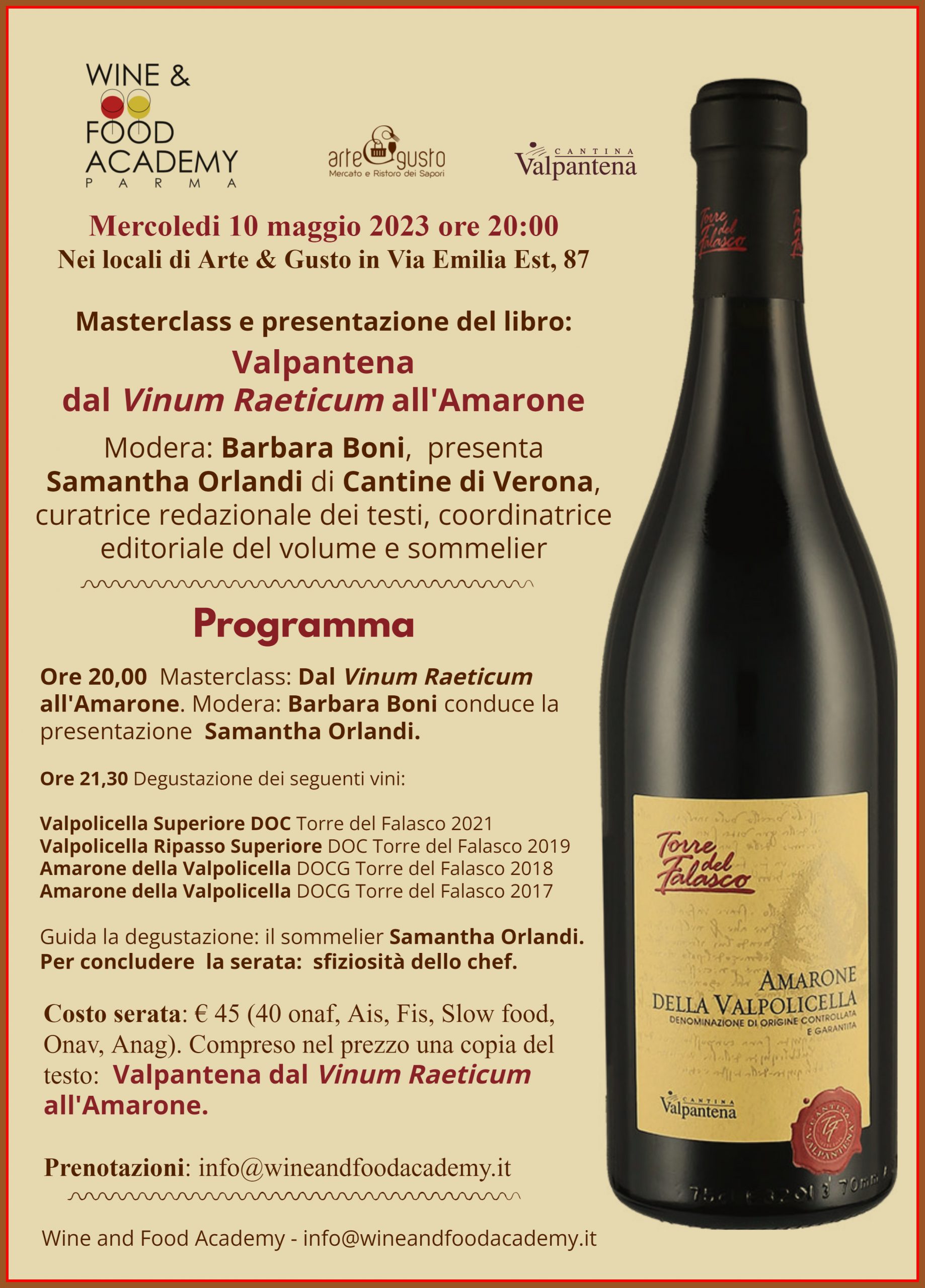 Martedì 10 maggio 2023 alle ore 20:00, Nei locali di Arte & Gusto in via Emilia Est 87, a Parma si terrà Masterclass dedicata all’Amarone: Valpantena dal Vinum Raeticum all’Amarone.