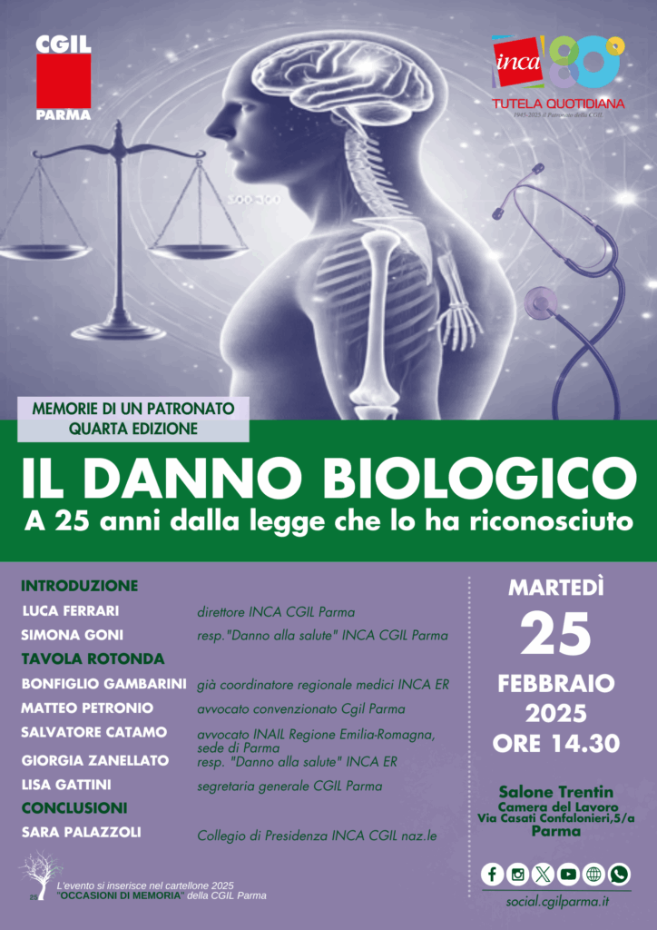 Torna anche quest’anno la rassegna “Memorie di un Patronato”, promossa da CGIL Parma e INCA CGIL Parma, con un appuntamento dedicato a “IL DANNO BIOLOGICO. A 25 anni dalla legge che lo ha riconosciuto” in programma per martedì 25 febbraio, alle ore 14.30, nel Salone Trentin della Camera del Lavoro di Parma, in via Casati confalonieri, 5/A.