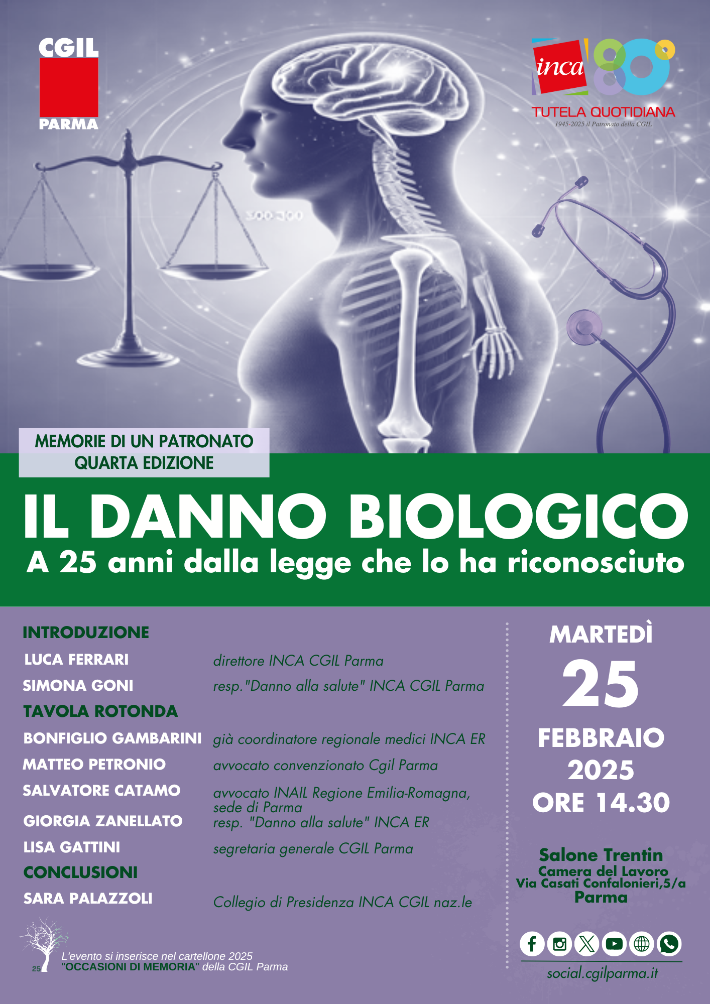 Torna anche quest’anno la rassegna “Memorie di un Patronato”, promossa da CGIL Parma e INCA CGIL Parma, con un appuntamento dedicato a “IL DANNO BIOLOGICO. A 25 anni dalla legge che lo ha riconosciuto” in programma per martedì 25 febbraio, alle ore 14.30, nel Salone Trentin della Camera del Lavoro di Parma, in via Casati confalonieri, 5/A.