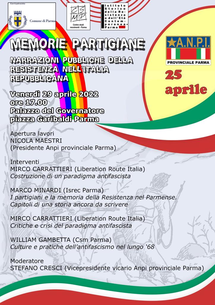Memorie Partigiane di UG 26 Aprile 2022 26 Aprile 2022 29 Venerdì 29 aprile alle ore 17 al Palazzo del Governatore in Piazza Garibaldi si terrà l’evento “Memorie Partigiane” organizzato dall’Anpi Parma. Segue la locandina contenente i dettagli dell’evento.