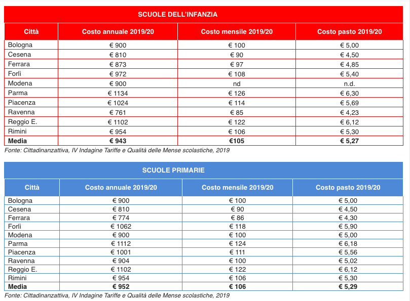 105 euro, a tanto ammonta il costo mensile, nell’anno 2019/2020, sostenuto da una famiglia media dell’Emilia Romagna con reddito ISEE di 19900 euro e un bimbo alla scuola dell’infanzia, 106 euro invece per la scuola primaria. A livello nazionale la media è di oltre 80 euro.