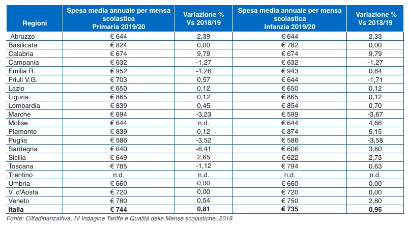 Il Nord si conferma l’area geografica con le tariffe più elevate, in media 842 euro per nove mesi di mensa nella scuola primaria, e 841 in quella dell’infanzia; segue il Centro, 724 euro nella primaria e 704 euro nell’infanzia; più contenuti i costi al Sud con 644 euro nella primaria e 632 nell’infanzia.