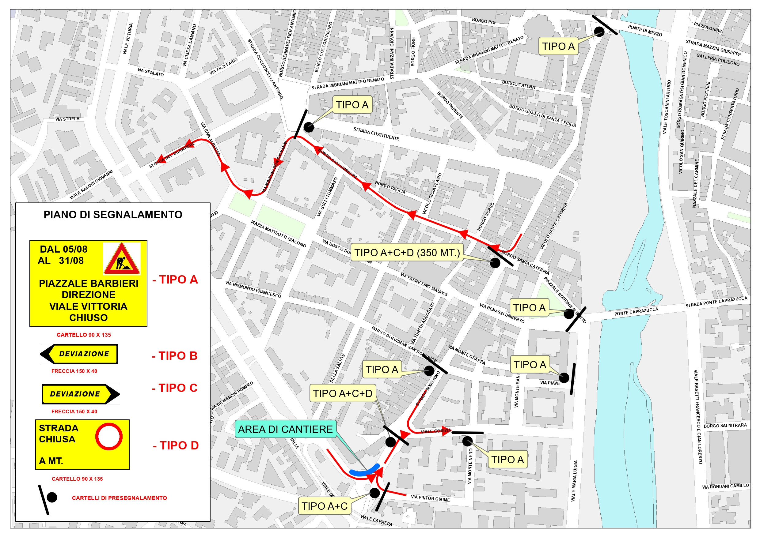 I veicoli che normalmente percorrono strada Bixio direzione viale Vittoria verranno deviati da apposito piano di segnalamento su percorsi alternativi ossia in borgo San Giuseppe, via Don Minzoni, via Riva e strada del Quartiere.