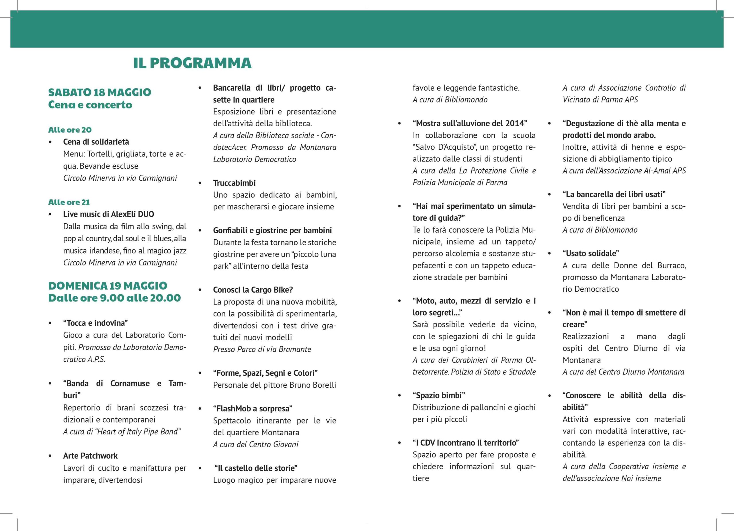 - Bancarella di libri/ progetto casette in quartiere Esposizione libri e presentazione dell’attività della biblioteca. A cura della Biblioteca sociale – CondotecAcer. Promosso da Montanara Laboratorio Democratico.