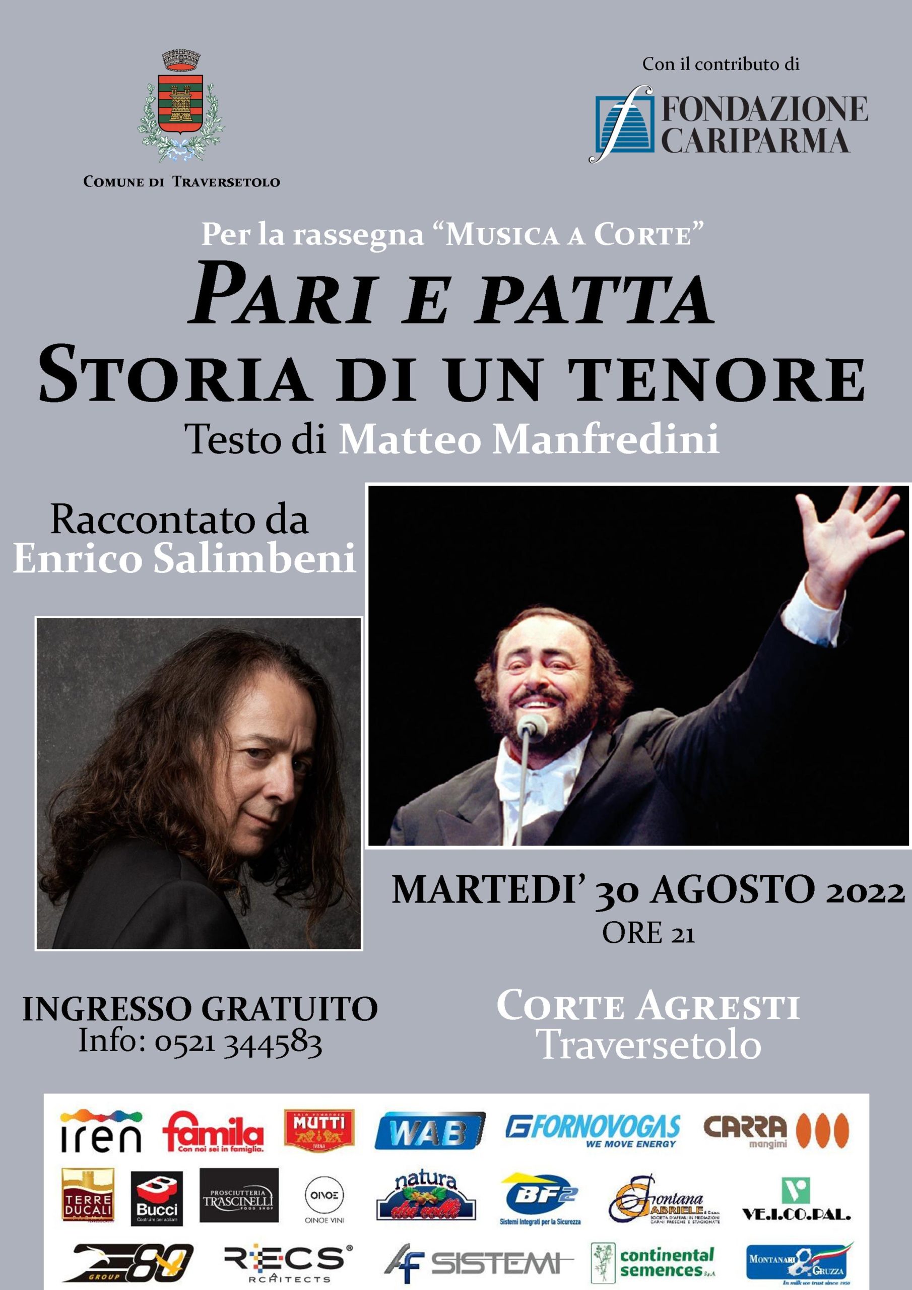 Sesto appuntamento della rassegna di eventi “Musica a Corte” con lo spettacolo Pari e Patta. Storia di un tenore martedì 30 agosto 2022 alle ore 21 in Corte Agresti.