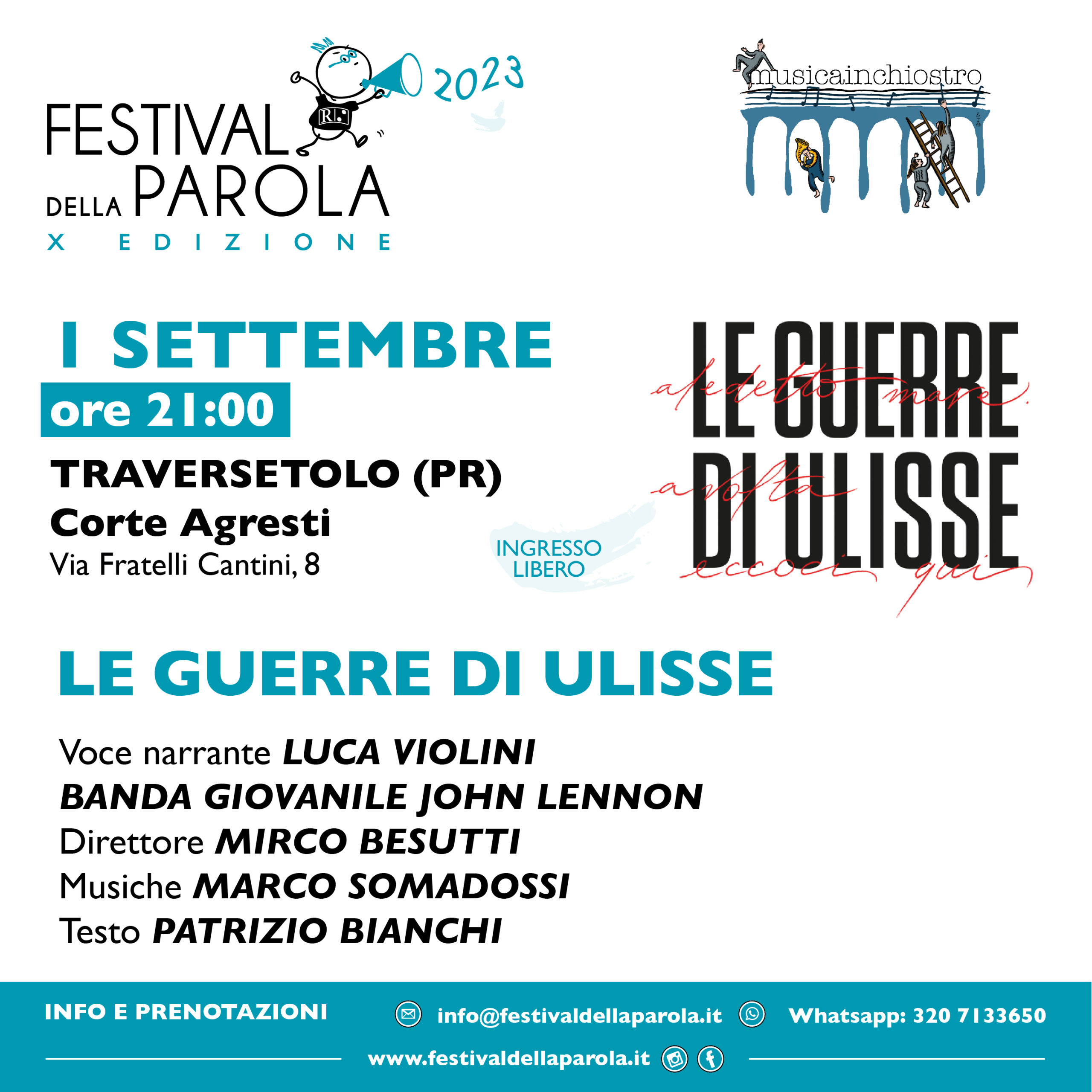 “LE GUERRE DI ULISSE” è un’opera moderna che nasce dalla collaborazione di Patrizio Bianchi (ex Ministro all’Istruzione) con la Fondazione Scuola di Musica Carlo e Guglielmo Andreoli diretta dal Maestro Mirco Besutti e con il compositore Marco Somadossi, le cui musiche originali sono eseguite dalla Banda Giovanile John Lennon, composta da più di 80 elementi (dai 13 ai 25 anni) con una numerosa presenza di allievi diversamente abili, pienamente integrati con il resto dell’orchestra. Voce narrante di questo ambizioso progetto artistico interdisciplinare che unisce letteratura, musica e recitazione, è il doppiatore Luca Violini. “LE GUERRE DI ULISSE” è una riflessione sul nostro presente; una denuncia dell’insensatezza della guerra e un messaggio di speranza in un momento difficile come quello che il mondo sta attraversando. Nel suo lungo viaggio, infatti, Ulisse, prenderà coscienza di ciò che allo spettatore appare chiaro fin dall’inizio: ovvero l’inutilità dell’uso della violenza per regolare i conflitti. All’inizio Ulisse non capisce il dramma che sta vivendo, ma in un passaggio chiave dello spettacolo arriverà ad ammettere che la guerra… “doveva essere veloce e fatta di gesta su cui costruire leggende eterne e invece è stata lunga e ha portato morte, distruzione e odio”.
