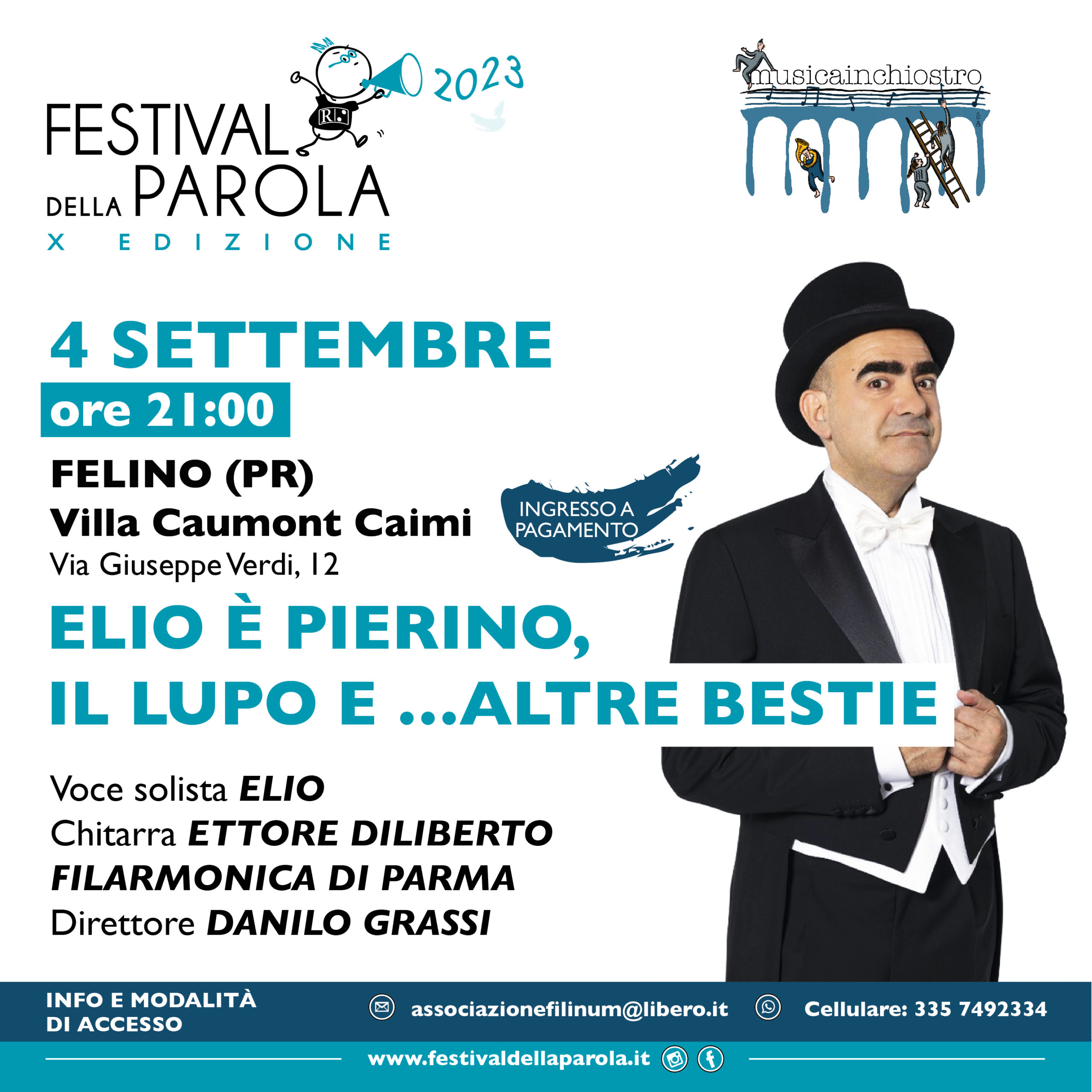 Il programma prevede nella prima parte l’esecuzione di PIERINO IL LUPO di Prokofiev (con Elio voce narrante) e alcuni brani lirici di Mozart e di Rossini, sempre eseguiti da Elio. Nella seconda parte, con la presenza sul palco anche di Ettore Diliberto (storico componente delle Storie Tese), l’esecuzione delle canzoni più note di “Elio e le Storie Tese”, arricchite dagli arrangiamenti classici eseguiti dalla Filarmonica di Parma.