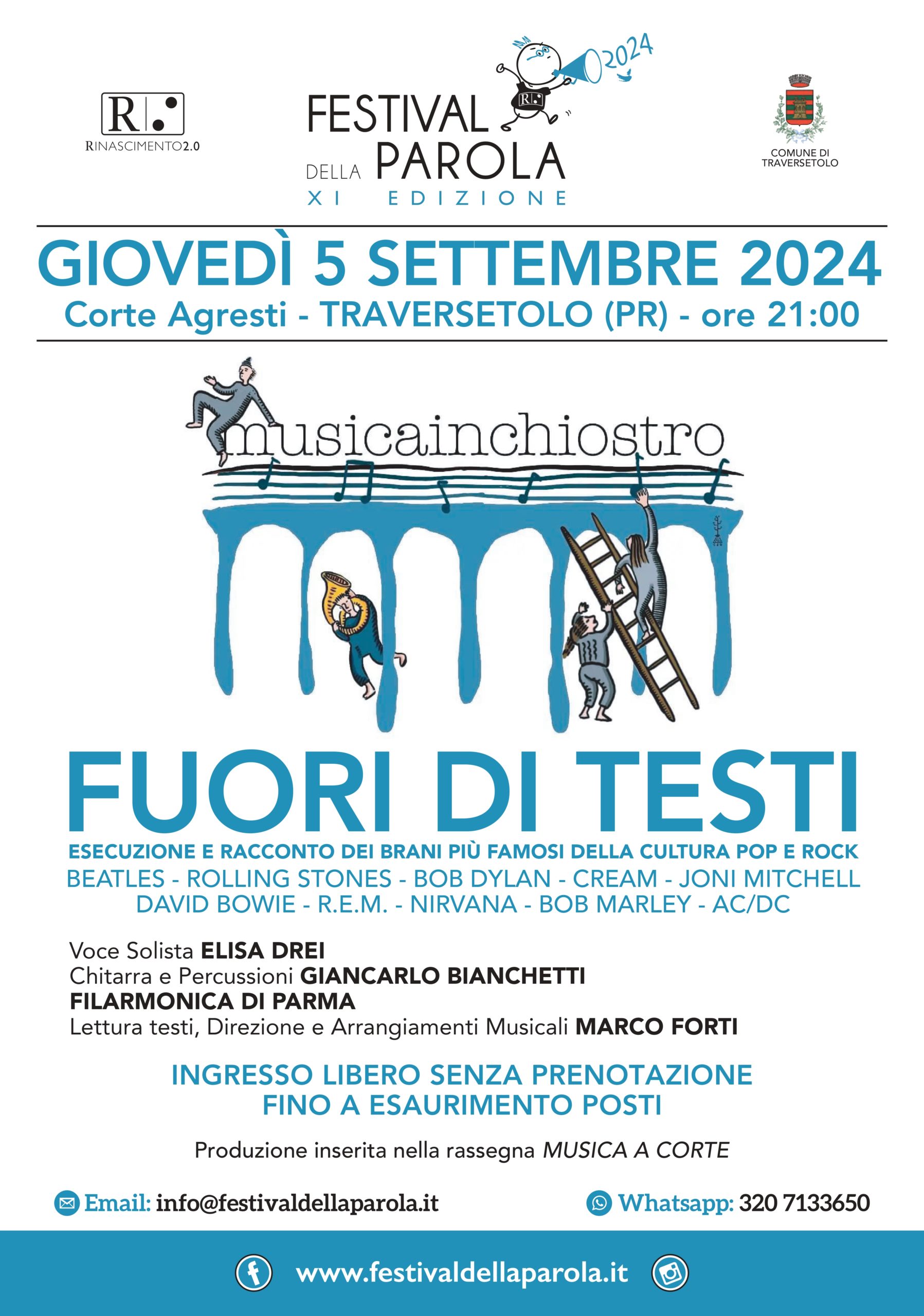 Cambio in corsa, dettato da ragioni organizzative, nella proposta artistica per il terzo appuntamento sinestetico di Musica In-Chiostro, la rassegna di note e parole del Festival della Parola. Il prossimo giovedì 12 settembre a Traversetolo, nella ormai famigliare cornice della Corte Agresti (Via Fratelli Cantini, 8), alle ore 21 andrà in scena FUORI DI TESTI, spettacolo-concerto commissionato dal Festival della Parola. Sul palco ELISA DREI voce solista, GIANCARLO BIANCHETTI chitarra e percussioni, insieme alla FILARMONICA DI PARMA. Lettura testi, direzione e arrangiamenti musicali di MARCO FORTI.