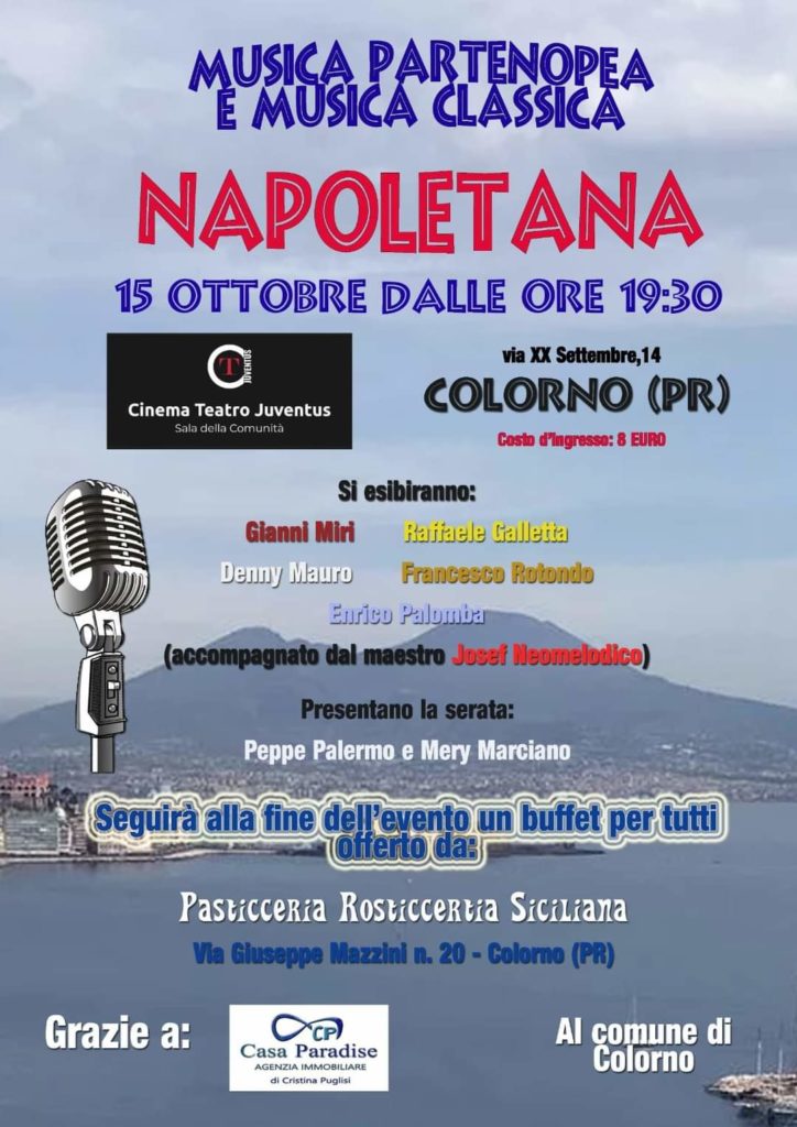 “Musica partenopea e classica napoletana” è la prima edizione di un appuntamento che ha l’obiettivo di riproporsi tutti gli anni. Il concerto si svolgerà sabato 15 ottobre a partire dalle 19.30 alla sala Juventus di via XX Settembre a Colorno.