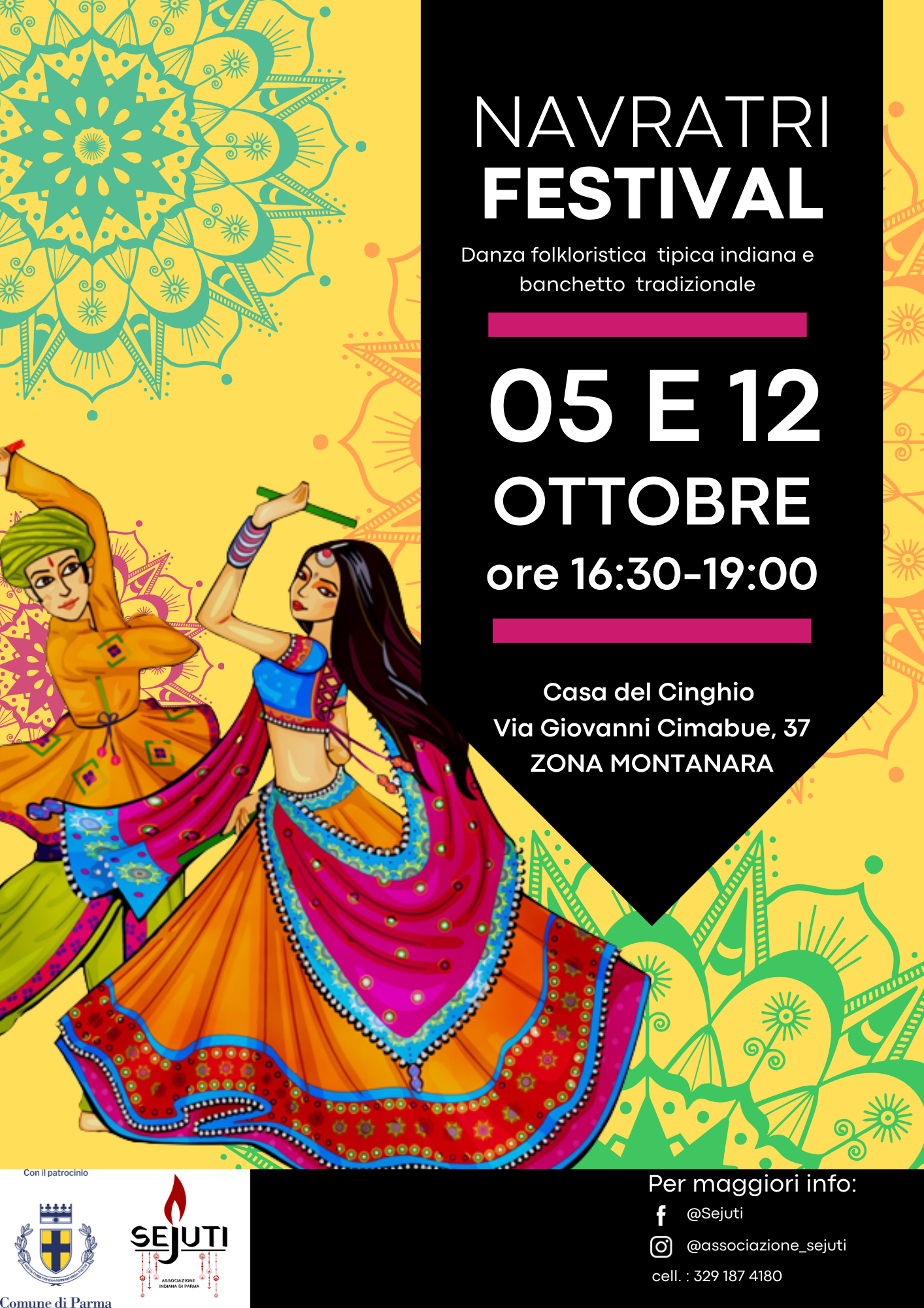Sabato 5 e sabato 12 ottobre, alla Casa del Cinghio in via Cimabue 37, dalle 16.30 alle 19, si svolgerà Navratri Festival, organizzato dall’Associazione Sejuti, con il patrocinio del Comune di Parma.