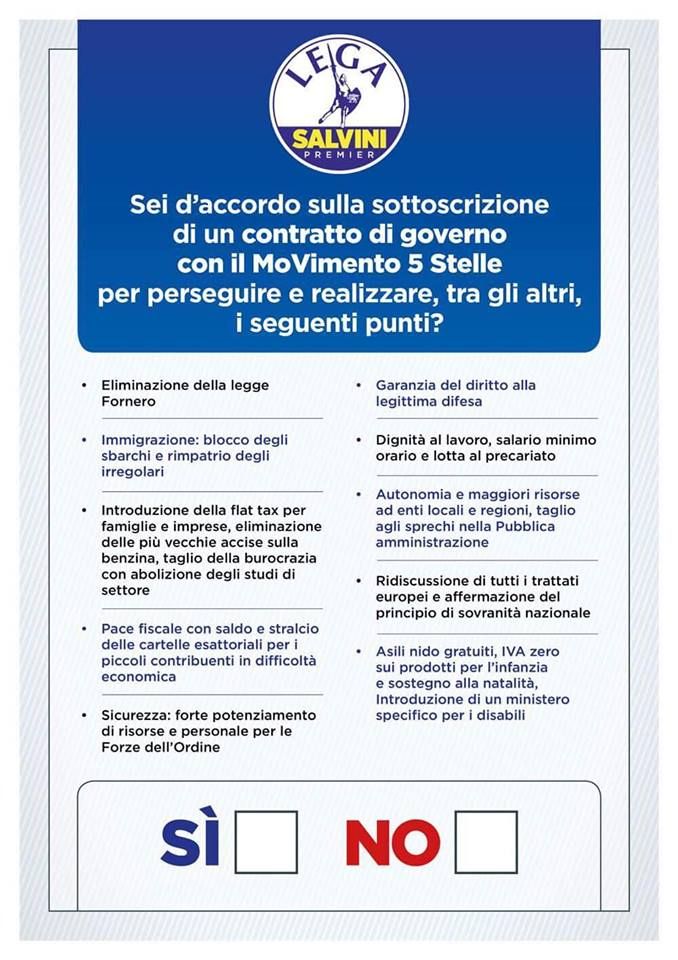 Con questo voto chiediamo alle persone se vogliono eliminare la Legge Fornero, bloccare gli sbarchi, iniziare un piano rimpatri per i clandestini, aumentare la sicurezza per le strade e nelle nostre case, avere asili gratuiti e ridiscutere il rapporto con l’Europa, per citare solo alcuni punti…