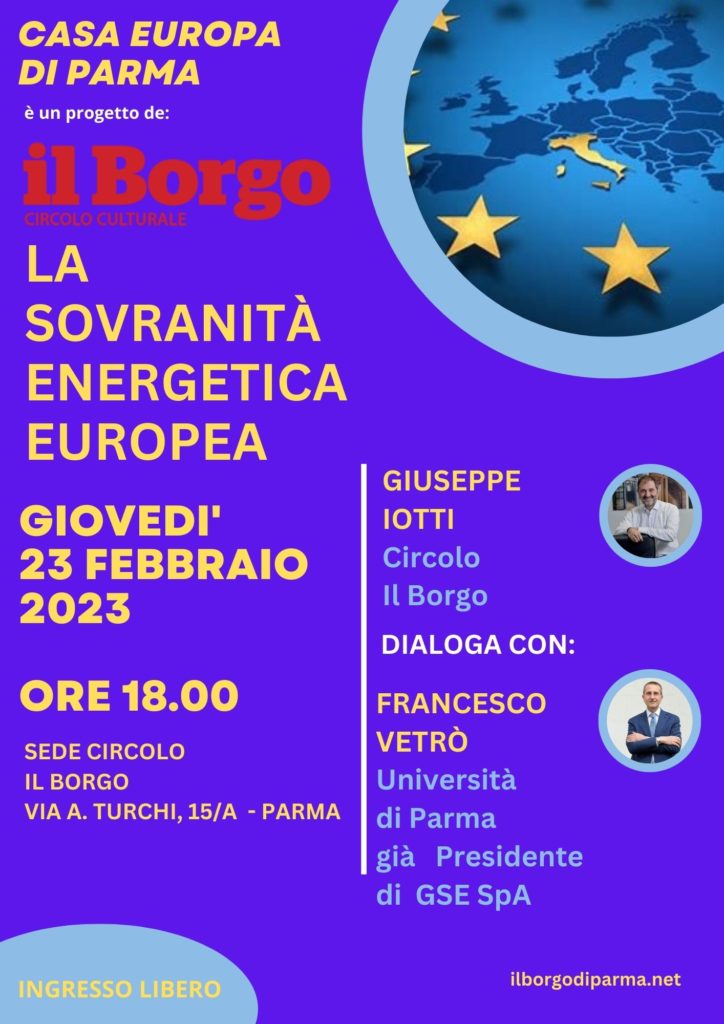 Giovedì 23 febbraio alle ore 18.00 nella sede del Circolo si terrà un incontro dal titolo “La sovranità energetica europea”. Giuseppe Iotti del Direttivo de Il Borgo e coordinatore di “Casa Europa di Parma” dialogherà con il prof. Francesco Vetrò, ordinario di diritto amministrativo dell’Università di Parma e già Presidente del Gestore dei Servizi energetici – GSE S.p.A. Si tratta del terzo appuntamento organizzato da “Casa Europa di Parma”, il gruppo di soci de Il Borgo che intende approfondire i principali temi dell’integrazione europea.