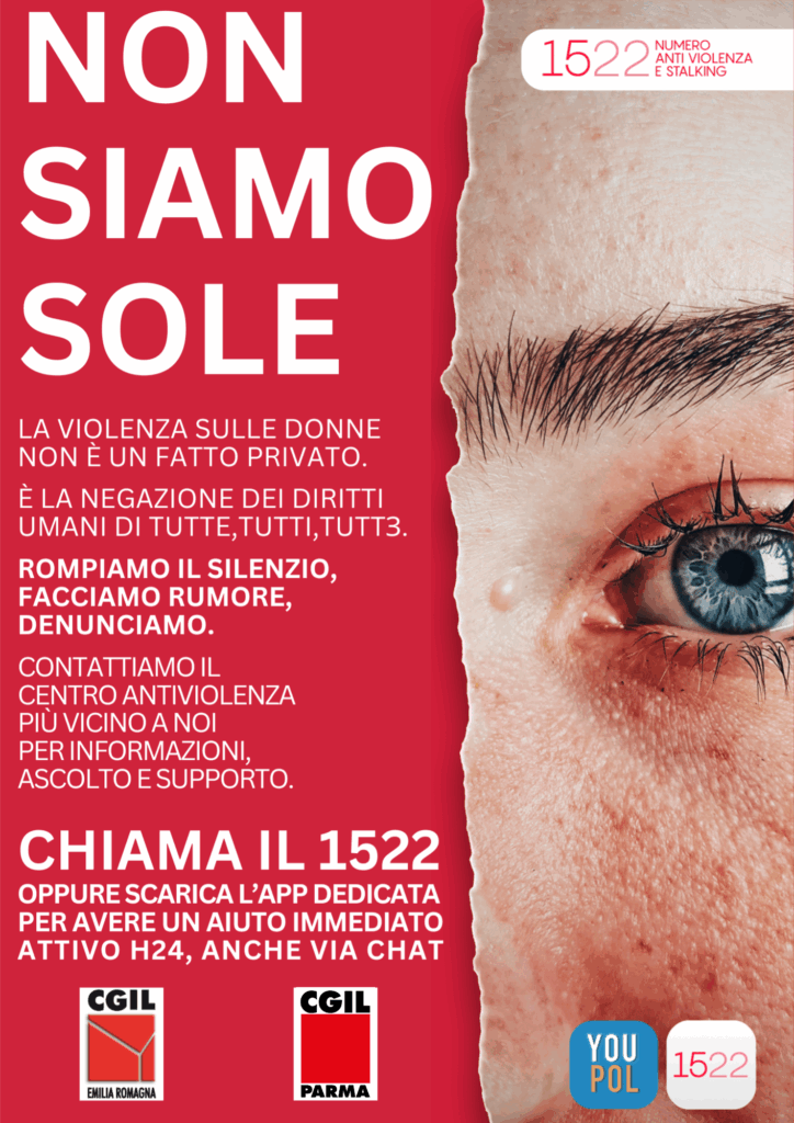 Per contribuire a rompere il silenzio, a fare rumore e a denunciare, il Coordinamento politiche di genere e nuovi diritti della Cigl Emilia-Romagna lancia la campagna di comunicazione Non siamo sole, per diffondere il numero di emergenza contro la violenza di genere 1522 e l’app You Pol, realizzata dalla Polizia di Stato, uno strumento gratuito e disponibile per tutti, semplice e sicuro, che può essere utile per contrastare la violenza di genere. Permette di inviare segnalazioni, anche in forma anonima, con la possibilità di allegare video, audio, immagini e testo.