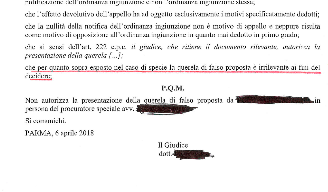 In data odierna e attraverso un’ordinanza del Tribunale di Parma, il giudice ha ritenuto irrilevante la presentazione di una querela per falso, presentata contro Parma Gestione Entrate, ai fini delle ingiunzioni di pagamento. (ndr: si tratta di una causa diversa da quella terminata con sentenza favorevole al Mnc, leggi)
