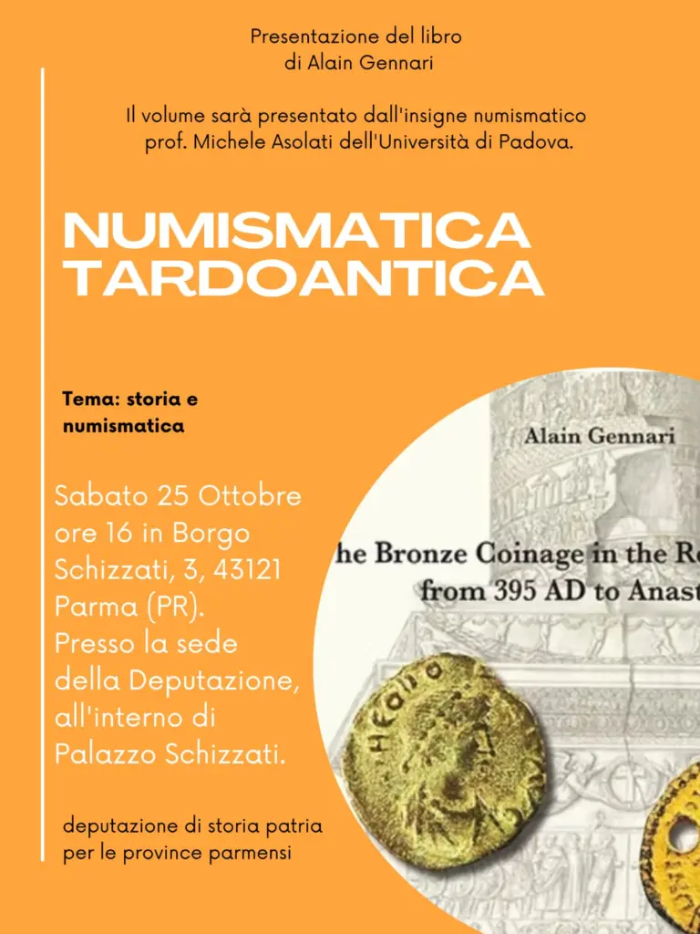 Sabato 25 ottobre alle ore 16 presso la sede della Deputazione, all’interno di Palazzo Schizzati, in borgo Schizzati 3 a Parma, si terrà la presentazione del libero di Alain Gennari sulla numismatica tardoantica.