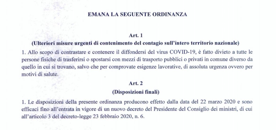 “Allo scopo di contrastare il diffondersi del virus Covid 19 è fatto divieto a tutte le persone fisiche di trasferirsi o spostarsi con mezzi pubblici o privati in comune diverso da quello in cui si trovano, salvo che per comprovate esigenze lavorative, di assoluta urgenza ovvero per motivi di salute”.