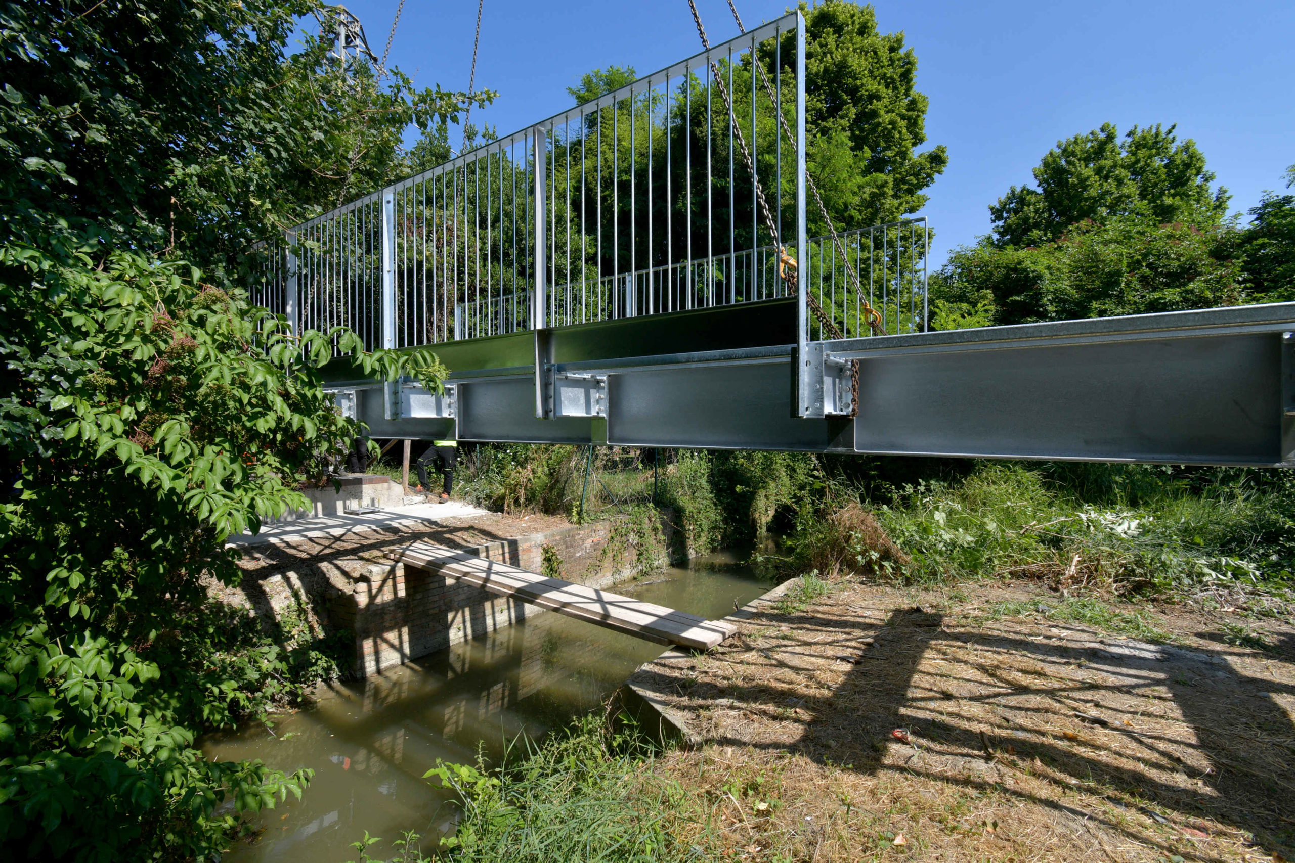 Ieri mattina hanno preso avvio le operazioni di posa del nuovo ponticello ciclopedonale sul Canale Maggiore nel quartiere Eurosia. L’intervento rientra tra quelli messi in campo dall’Amministrazione per il recupero, la riqualificazione e la messa in sicurezza di ponti e ponticelli che attraversano canali e corsi d’acqua presenti nel territorio comunale.