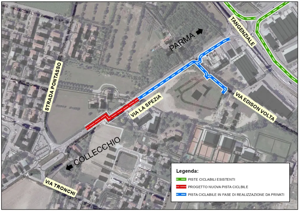 Questo nuovo segmento, unitamente alla pista ciclabile attualmente in fase di ultimazione da parte di soggetti privati, consentirà di completare un collegamento diretto e sicuro tra la rotatoria di via Pontasso e la Tangenziale di Parma, contribuendo al miglioramento della rete di mobilità dolce dell’area.