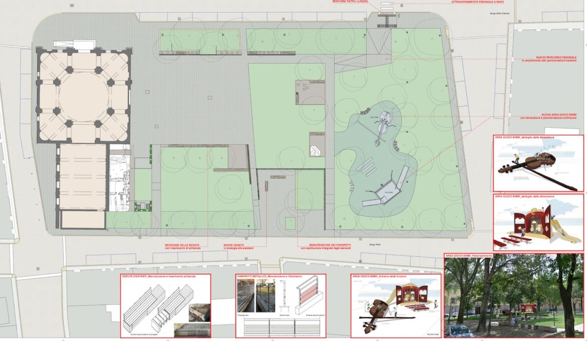 Altri interventi riguardano la manutenzione del verde e l’inserimento di arbusti in alcuni quadranti, lasciandone uno libero per permettere agli anziani che frequentano il piazzale di inserire essenze arboree di loro gradimento.