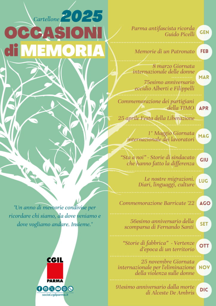 Anche per questo 2025 la CGIL Parma propone una calendario denso di date emblematiche che intendono promuovere e rinnovare iniziative di valorizzazione e riscoperta delle vicende storiche, politico-sindacali e non solo, che hanno dato linfa e fondamenta al movimento dei lavoratori e alla nostra identità collettiva. Una serie di iniziative, appuntamenti e commemorazioni, momenti di approfondimento culturale, giornate simboliche, occasioni di incontro e confronto che costituiscono il cartellone 2025 delle OCCASIONI DI MEMORIA, dove, mese dopo mese, sono raccolte alcune delle date più significative che compongono, per la CGIL Parma, “Un anno di memorie condivise per ricordare chi siamo, da dove veniamo e dove vogliamo andare. Insieme”.