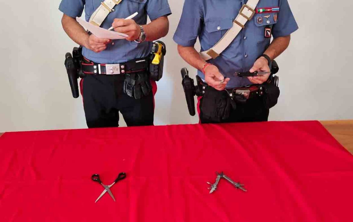 A seguito della segnalazione che indicava l’aggressore in possesso di un coltello, veniva immediatamente sottoposto a perquisizione personale ed infilato nella cintura dietro la schiena, veniva rinvenuto un coltello a serramanico della lunghezza complessiva di 16 cm. All’interno dello zaino venivano rinvenuti un paio di forbici, un cutter ed una pinza multiuso. Il tutto veniva posto sotto sequestro.