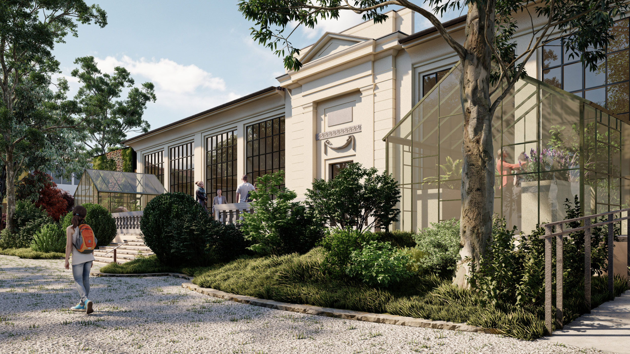 Sarà realizzato un nuovo camminamento in quota, con un pergolato destinato a ospitare nuove collezioni vegetali sul lato nord delle Serre Ferdinandee. La testata ovest, un edificio eretto negli anni ’60 a fianco delle serre stesse, sarà riedificata in una nuova veste contemporanea per ospitare attività di accoglienza, caffetteria e bookshop. La struttura sarà caratterizzata da pareti verdi, riproposte anche lungo la porzione orientale delle Serre Ferdinandee a schermo dei locali di servizio; la scelta delle piante da impiegare, rampicanti e non solo, è frutto del lavoro congiunto tra il personale dell’Orto Botanico e l’agronoma paesaggista Annachiara Vendramin.